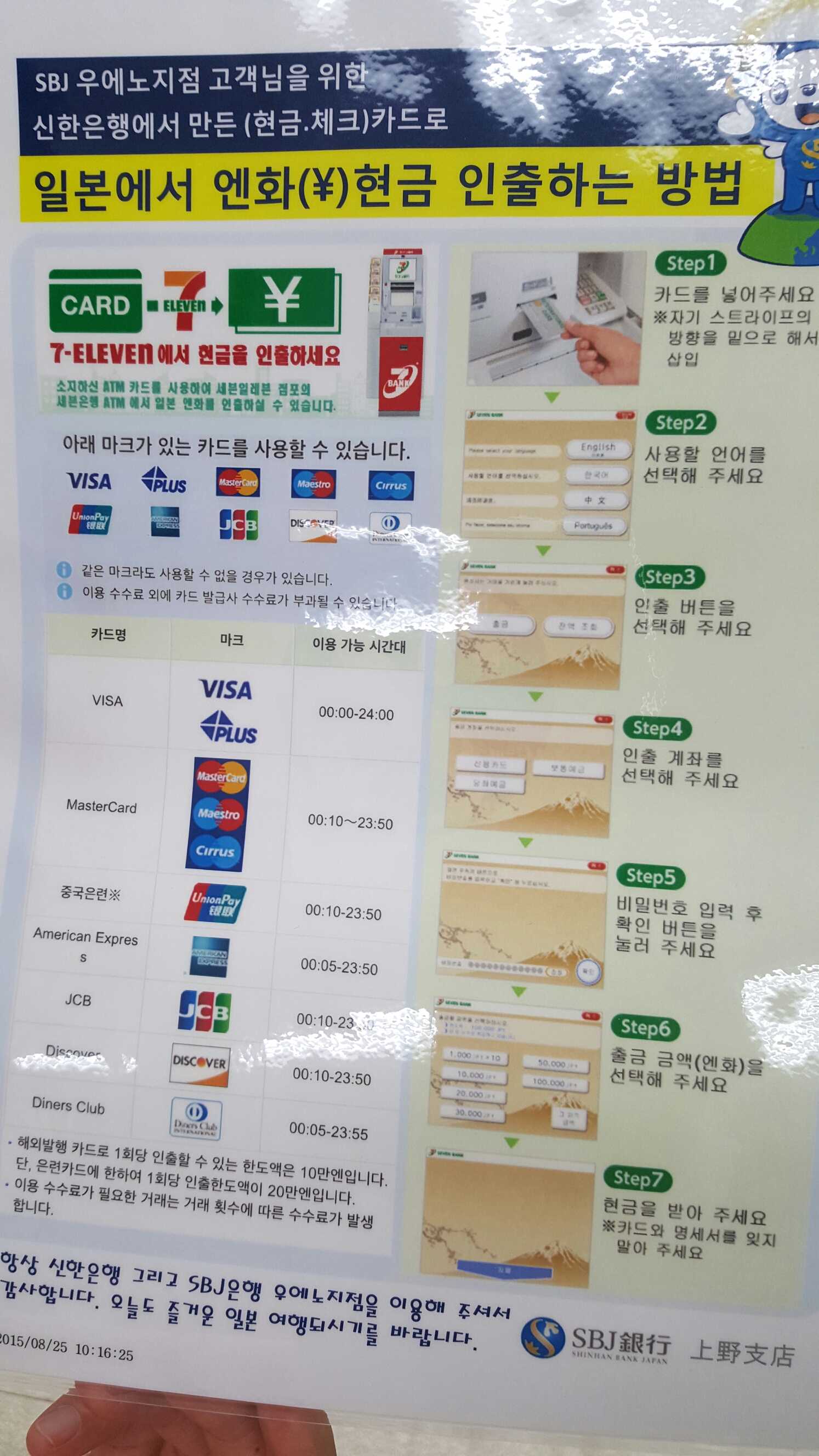 우선, 전날 해결하지 못한 현금 부족 문제를 극복하기 위해 신한은행 우에노지점으로 가장 먼저 달려갔다. 숙소에서 불과 3분 거리에 위치한 이곳을 알게 된 것은 현찰이 없다는 절박한 위기에서 비롯된 정보력의 결과였다. 신한은행은 도쿄에 단 2개의 지점을 내고 있는데, 그 중 하나가 우연히도 숙소와 같은 동네라는 사실 자체가 나에게는 구세주처럼 느껴졌다. 이곳만 가면 나의 모든 문제가 해결될 수 있을거라는 기대를 가지고 오픈 전에 이미 도착하여 셔터문을 하염없이 바라보았다. 이윽고 문이 열리고, 오직 나만을 위하여 전 지점 직원들의 일본 특유의 유난한 단체 인사가 끝나고, 나는 현금 문제의 해법을 금방 찾을 수 있었다. 한국과 계좌 연동을 통한 지점에서의 인출은 불가하고, 다만 내 현금카드가 국제카드 규격에 부합한다면(비자, 마스터 등), 세븐일레븐에서 내 계좌 연동을 통한 즉시 엔화 인출이 가능하다는 것이다. 내 현금카드 겸 체크카드가 국제통용 카드라는 것 조차 이번에 처음 알았고, 이렇게 간편하게 인출 가능하다는 것은 더더욱 신선하고 유용한 정보였다. 세븐일레븐이 자랑하는 세븐뱅크는 거래명세서 마저 한글을 지원할 정도로 완벽한 한글화를 보여주었고, 나는 수수료율 90% 우대 당시보다 3만원 정도를 더 투자하여(혹은 버려가며) 4만엔을 인출할 수 있었다. 현금 부족 문제에 대한 과도한 심리적 압박의 반대급부로 인하여 과다인출 하였다는 것은 나중에 알게된 사실이다….