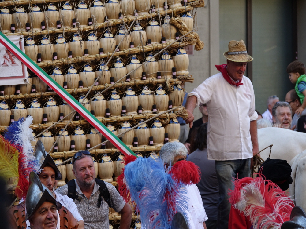 9월은 추수의 계절이며 첫 와인을 출하하는 시점이기도 하다. 그에 따라 피렌체와 인근 투스카니 지역에서는 와인 출하와 관련된 여러 가지 전통행사들을 진행하는데, 내가 본 이 행렬도 그 일환이었던 것이다. 행사의 정식명칭은 “Carro Matto (Crazy Cart) in Florence”로, 굳이 번역하자자면 ‘피렌체의 미친 우마차 행렬’ 쯤 될 것이다. 이 행사는 매년 9월 마지막 토요일에 펼쳐진다. 우마차는 한 쌍의 흰 소가 끌고 가며, 여기에는 수백병의 와인이 실리게 되는데, 이것을 싣는 기술 자체가 하나의 전통 기술로서 대대로 이어져 내려오고 있다. 행사의 취지는 루피나에서 생산된 첫 와인을 수도인 피렌체 시내로 가지고 와서 통치자에게 바치며 축복을 받고, 모든 시민들과 함께 수확의 기쁨을 나누는 것이다.
