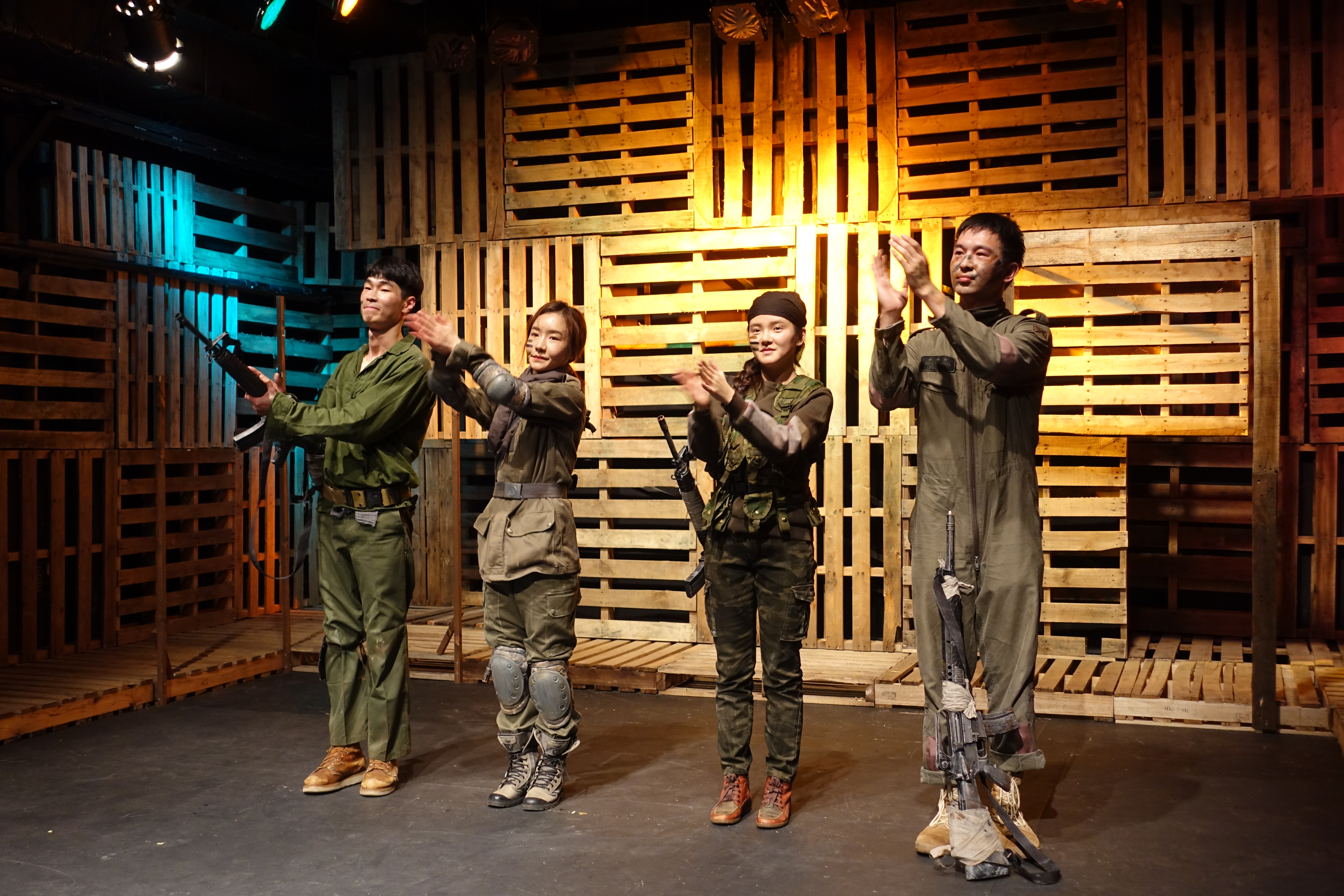 그런데 이런 시도는 그동안 참 많았다. 우리는 이미 「플래툰(1987)」이나 「태극기 휘날리며(2004)」같은 전쟁 영화를 통해서 전쟁의 참상, 인격적 파멸, 가장 밑바닥에서 들려오는 외침 같은 것들을 클리셰처럼 소비해왔다. 그렇다면 전쟁의 시각적 스펙터클을 포기할 수밖에 없는 연극은 조금 다른 ‘무언가’를 주어야 한다. 그 ‘무언가’를 위한 장치가 네 개 이야기, 네 명의 인물이었을텐데, 얼마나 효과적으로 작동했는지는 의문이다. 일단 네 개의 이야기로 꾸미기 위해서 서로 다른 시대에 주목하겠다는 의도는 알겠으나, 별로 효과적이지 않은 에피소드들이 있다. ‘1952년 한반도’와 ‘2028년 서울’은 주제 의식을 가장 명징하게 드러내면서도 서로 다른 인물들의 협연이 적절한 합을 이루고 있다. 하지만 ‘1934년 간도’는 분량도 짧고 의도도 명확하지 않다. 그냥 여러 시대를 포괄하기 위한 구색 맞추기로 보인다. 전체 러닝타임이 짧은 만큼, 이러한 불명확한 서사를 확충하면서 완결성을 높이던지, 아니면 재미와 주제의식이 분명한 에피소드에 온전히 집중할 필요가 있다. 내 생각에는 ‘1952년 한반도’와 ‘2028년 서울’만 대비시켜도 작품의 주제의식은 훨씬 명확해지고 몰입도도 높아지리라 본다.