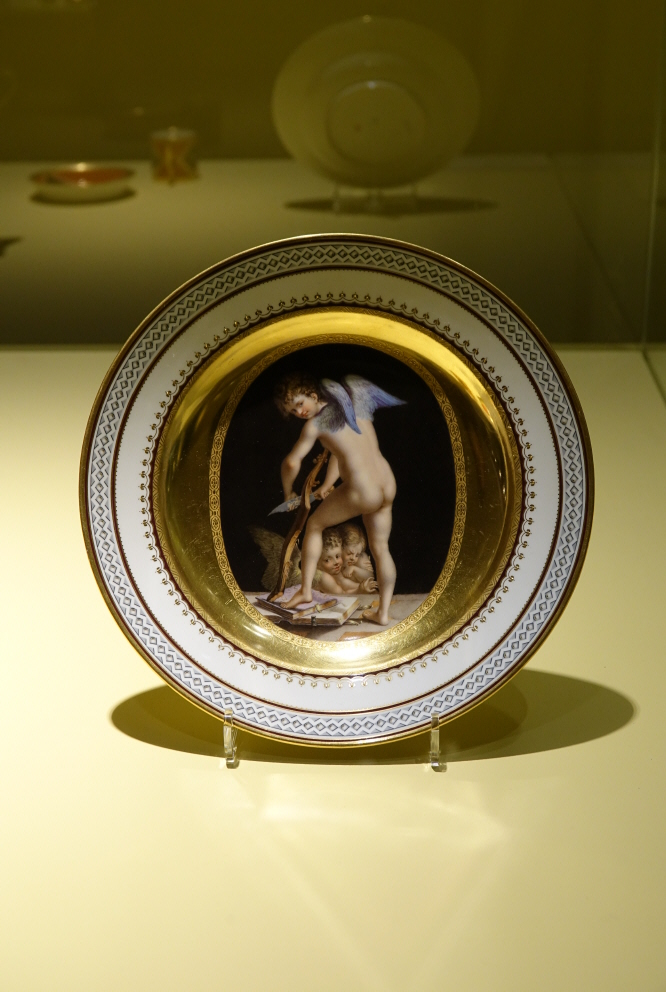 특히 파르미자니노(Parmigianino)의 <큐피드(1523-1524)> 모작이 그려진 접시는 빈 미술사박물관에서 원작을 보았던 추억과 맞물려 더욱 인상 깊었다. 르네상스의 대가들이 모든 것을 완성해 버려서 어쩔 수 없이 늘어지는 관능성을 표현했던 저 마니에리스모의 육체처럼, 그것을 담고 있는 도자기도 화려함의 극치에서 더 이상 갈 곳이 없어서 파르미자니노의 그림을 품은 것 같다.