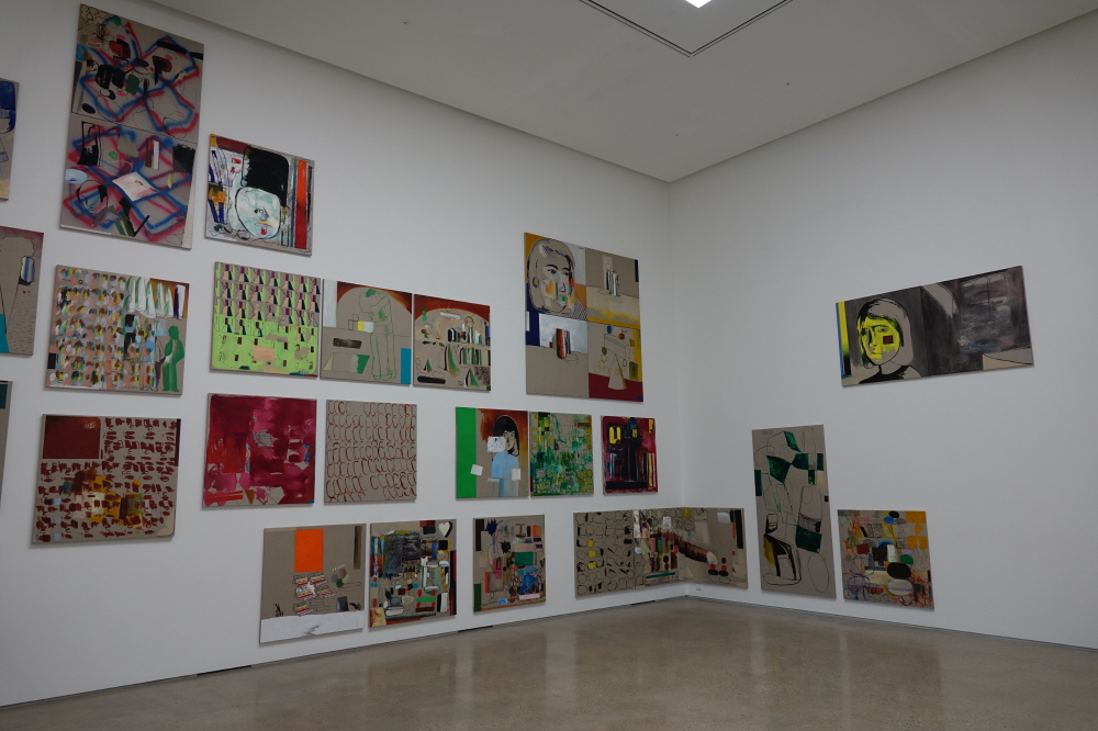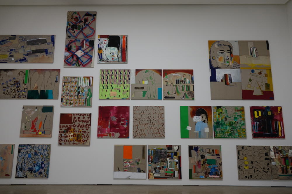 PMK 갤러리에서 열린 이번 개인전에서는 우선 60여점의 리넨 캔버스 회화가 1층 전체에 둘러져 있다. 대부분 강박적인 정사각형으로 재단된 작품들은 하나하나가 독립적인 작품이기는 했지만 대체로는 서로와의 관계 속에서 더 큰 작품으로 기능하는 모듈회화로 볼 수 있었다. 어떤 작품들은 일군의 수직-수평으로 배열되어 명확한 타일 패턴이 되었고, 어떤 작품들은 규칙성 없이 더 넓은 평면 위에 자유롭게 내던져졌다. 이들 자유로운 작품들에는 추상적이고 무성의한 패턴들과 초등학생의 낙서 같은 사람 형태가 병치되었다. 개별 작품들은 ‘잡초들’, ‘버려진 공원’, ‘다소 오래된 동네’와 같은 의미심장한 제목들이 붙어 있지만, 사실상 작품과 제목의 관계에 대해서 알고 있는 사람은 이 세상에서 백현진 작가 한 사람 뿐이다. 우리는 그저 한 가지 사실만을 알 수 있는데, 인간은 추상적이고 난잡한 패턴들 속에서 재현적인 형태, 그중에서도 특히 인간을 암시하는 형태를 찾아내려는 근원적인 욕망을 가지고 있다는 사실이다.