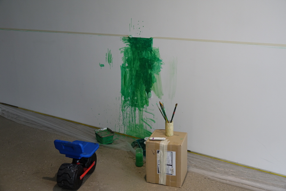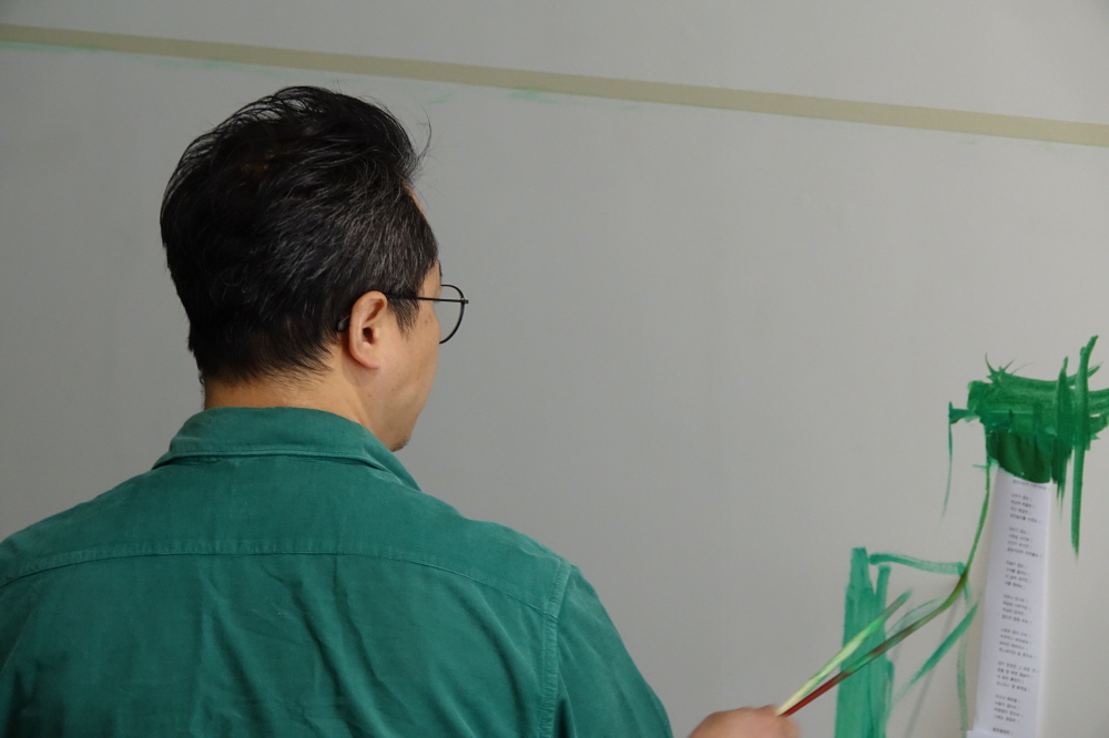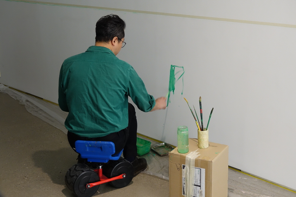 그런데 백현진의 노동요는 이러한 공동체의 단결, 리듬감, 연대의식 등과는 또 전혀 다른 형태를 띄고 있으니 다시 한 번 아이러니가 시작된다. 이번 개인전에서는 퍼포먼스 ‘뮤지컬: 영원한 봄’이 출품되었다. 이 작품은 시, 노래, 연기, 페인팅, 박자가 결합된 종합 퍼포먼스이다. 우선 작가는 시를 들고 갤러리에 들어선다. 그 시를 벽에 붙이고 초록색 물감을 붓에 묻히기 시작한다. 이제 시는 노래 가사였음이 밝혀진다. 작가는 노래를 부르며 붓을 들어 벽에 초록색을 칠한다. 작가가 그리는 것은 아무것도 아니다. 그냥 붓이 지나간 흔적일 뿐이다. 그 흔적은 벽에도, 가사가 적힌 종이에도 남는다. 그리고 가사가 적힌 종이 뒤편에도 남는다. 초록색은 점차 넓은 영역을 확보한다. 어느 순간 작가는 마스킹 테이프를 뜯고 그 위에 초록색 점을 찍기도 한다. 시종일관 부르는 노래는 강한 울림이 있지만 영혼이 없다. 노래가 계속될수록 가사도 함께 지워진다. 노동요 답게 후렴 가사(“영원한 봄”)가 반복되지만 그 누구와도 합의하지 않았기 때문에 되돌아오지 않는 외로운 후렴구이다. 시간이 흐르며 벽은 점점 더 흥건해진다. 결국 가사는 아예 보이지 않게 되고 작가는 아무런 말 없이 자리를 뜬다.