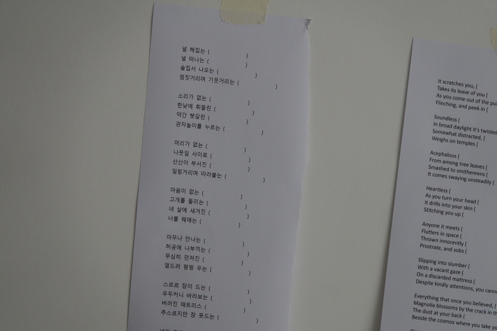 되돌아오지 않는 노동요는 외롭고 아무짝에도 쓸모가 없다. 그것은 그저 열량의 소모일 뿐이다. 작가가 실시간으로 그려낸 흔적도 마찬가지이다. 아무런 의미도, 서사도, 형태도 없다. 허망한 몸부림에 지나지 않는다. 부재는 존재에의 갈망을 증폭한다. 여기에 서 있었던 나를 포함한 열댓명 남짓한 관람객들은 그것을 느꼈을까? 되돌아 오지 않는 후렴 가사, “영원한 봄”을 함께 받아쳐줄 누군가가 필요했다는 것을, 그게 다른 누구도 아닌 나 자신이었다는 것을.