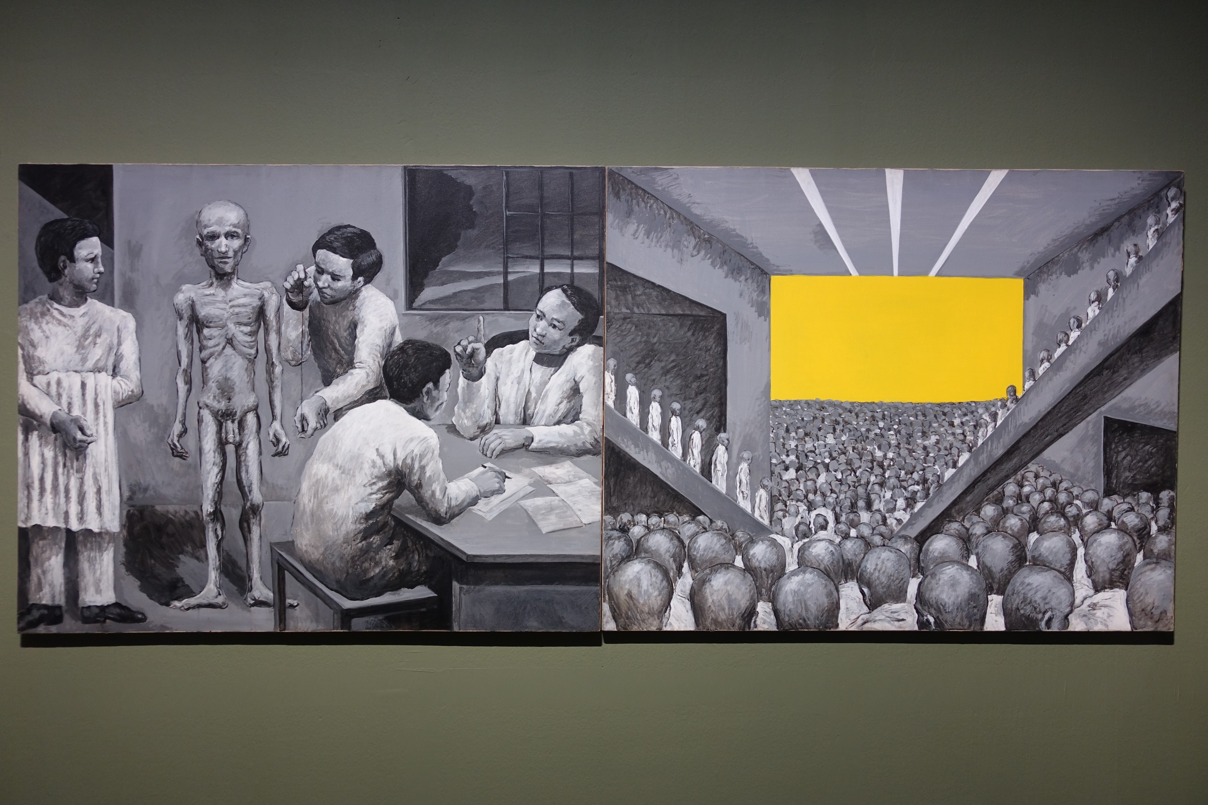 민정기의 회색빛 두 폭 제단화는 알 수 없는 실험 집단으로부터 계측을 당하는 비천한 존재와 초대형 극장을 가득 메운 영혼 없는 군중을 대비시켜 놓았다. 좌측 화폭의 삐쩍 마른 인물은 실험이나 고문으로 완전히 넋이 나가버린 모양인데, 심지어 그는 벌거벗었다는 사실조차 잊었다. 벌거벗음으로 존엄성을 논할 수는 없지만, 벌거벗김을 당하고 그 사실을 망각했다면 이제는 존엄성의 바닥까지 간 것이다. 하지만 그에 아랑곳하지 않고 계측과 실험은 계속되고 있다. 아마도 녹봉을 먹고 사는 모양인 흰 가운을 입은 인물들은 자신들이 행하는 일들이 실존적 인간에게 미치는 영향력에 대해서는 일말의 관심도 없는 것 같다. 한편, 우측에 대비된 화면에는 똑같은 옷차림, 똑같은 머리 모양의 군중이 강렬하게 대비되는 노란색 화면을 바라보며 숨을 죽이고 있다. 행동하는 예술가였던 민정기는 3S로 대변되는 군사정권의 우민화정책을 비꼬며 군중 속에서 단 한사람이라도 실존을 자각하며 관객을 향해 뒤돌아보기를 염원하고 있다. 좌측의 가련한 남자를 다시 보니, 그 염원이 쉽사리 이루어질 것 같지는 않다.