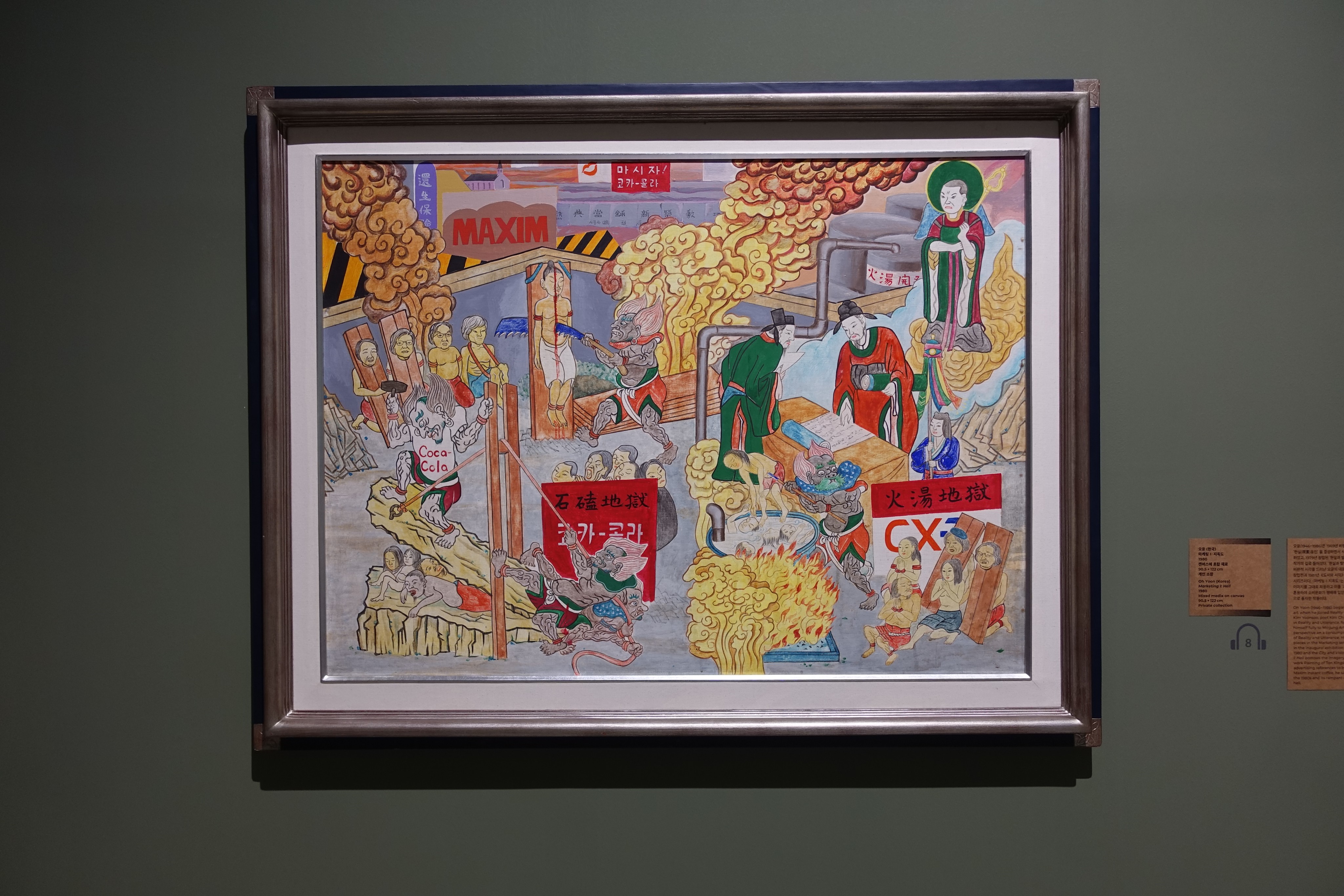 민정기보다 한 발 더 앞장서서 행동했던 오윤은 마케팅 메시지에 잠식된 시대상을 지옥도로 바라보고 있다. 유튜브 동영상 하나를 보려고 해도 10분에 한번씩 머저리 같은 틱톡 광고를 보아야 하는 우리 현실에서는 1980년의 광고가 도대체 무슨 문제일까 싶지만, 이미 가득 찬 상태에서 하나를 더 ‘얹는’ 것과 아예 없던 상태에서 하나가 ‘생기는’ 것에는 큰 차이가 있다. 컬러 TV가 보급되고, 인쇄 매체가 발전하고, 글로벌 기업들이 하나 둘 국내 시장에 진출하던 그 시기에 받아들이는 상업주의의 충격은 현재의 눈으로 가늠하기 어렵다. 민족적 주체성을 강조하는 진영의 중심에서 시각예술, 아니 시각’운동’의 선봉에 섰던 오윤에게 손에 잡힐 수 없는 유토피아를 제시하며 끝없는 소비에의 헛된 갈망만을 자극하는 마케팅은 그저 지옥도의 살벌한 풍경에 지나지 않았던 모양이다. 코카콜라로 대변되는 거대 외세-자본과 결탁한 옥졸들은 자본주의의 희생양들을 신명나게 난도질하고 튀기면서 즐기고 있다. 오른쪽 하단에 키를 차고 대기하고 있는 죄수들이 재미있는데, 맨 앞에 있는 남성과 바로 뒤에 있는 여성은 절체절명의 순간에도 아랑곳하지 않고 발가락 끝으로 무언의 교감을 나누고 있다. 마침 펄펄 끓는 가마에 죄인 하나를 던지려던 참인 옥졸에게 이 장면이 딱 걸렸는데, 다음 순간에 어떤 참상이 펼쳐질지 자못 궁금하다.