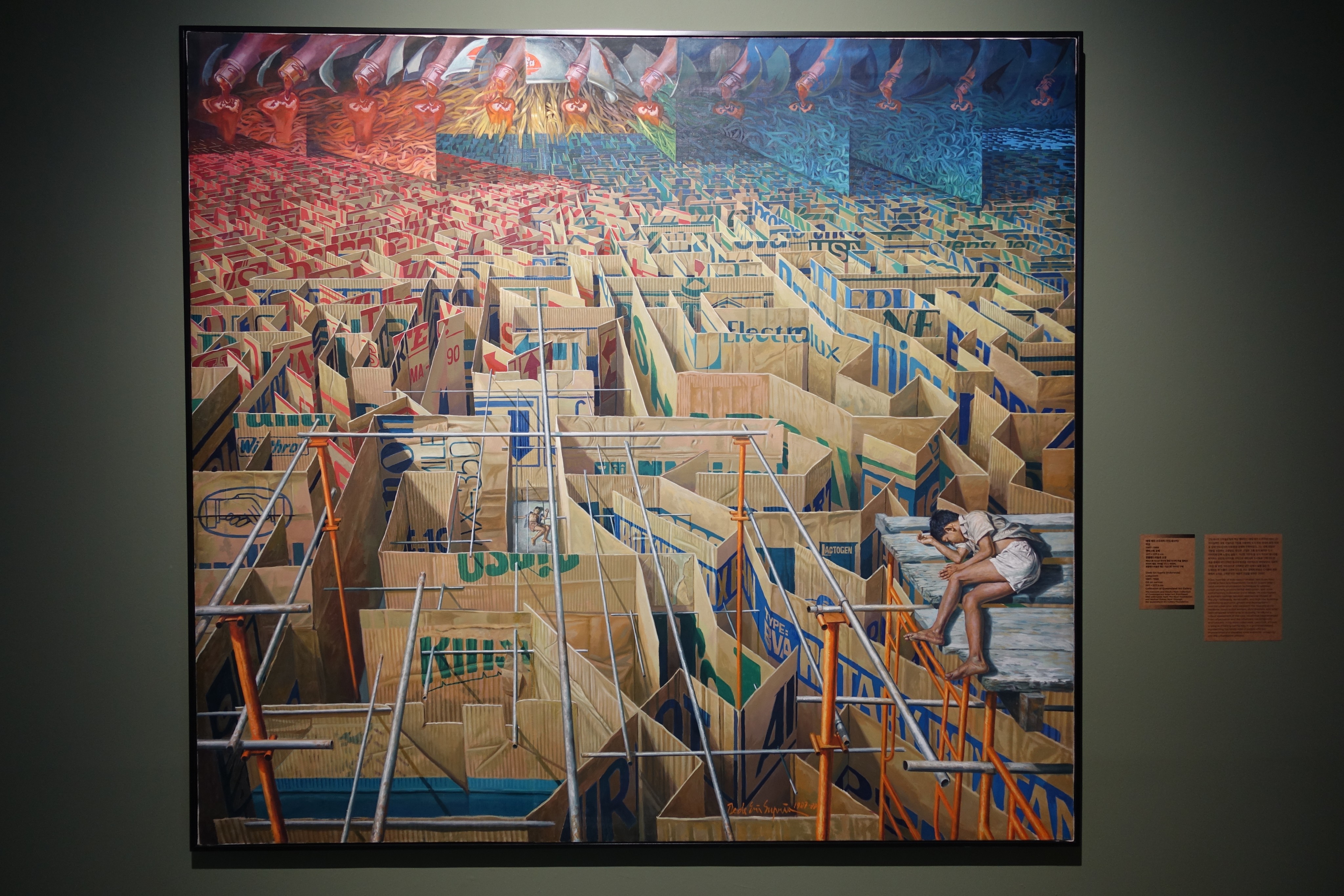 인도네시아의 사회환경 문제에 주목했던 데데에리 수프리아의 「미궁」은 한 눈에 보아도 어마어마한 공력이 들어간 대작이다. 급격한 도시화의 한편에서 오히려 그 명암이 강렬하게 대비되는 슬럼가의 주거문제와 빈곤을 다루고 있다. 완벽한 원근법적 구도와 상자의 질감 하나하나를 또렷하게 살리는 표현의 기량이 발걸음을 멈추게 한다. 전경은 수직수평으로, 후경은 사선 구도로 소실점의 방향이 바뀌는데, 화면 끝까지 치밀하게 구조물을 쌓아 올렸다. 그리고 그 뒤로 초현실적인 벽들이 사선으로 가로막고 버티며 일말의 희망도 없는 폐쇄적 공간을 창출한다. 수많은 구획 속에서도 가벼운 몸 하나 편히 눕힐 공간을 찾지 못한 두 어린 영혼은 지금 이 순간 우리가 돌아보아야 할 존재들을 상기시킨다.