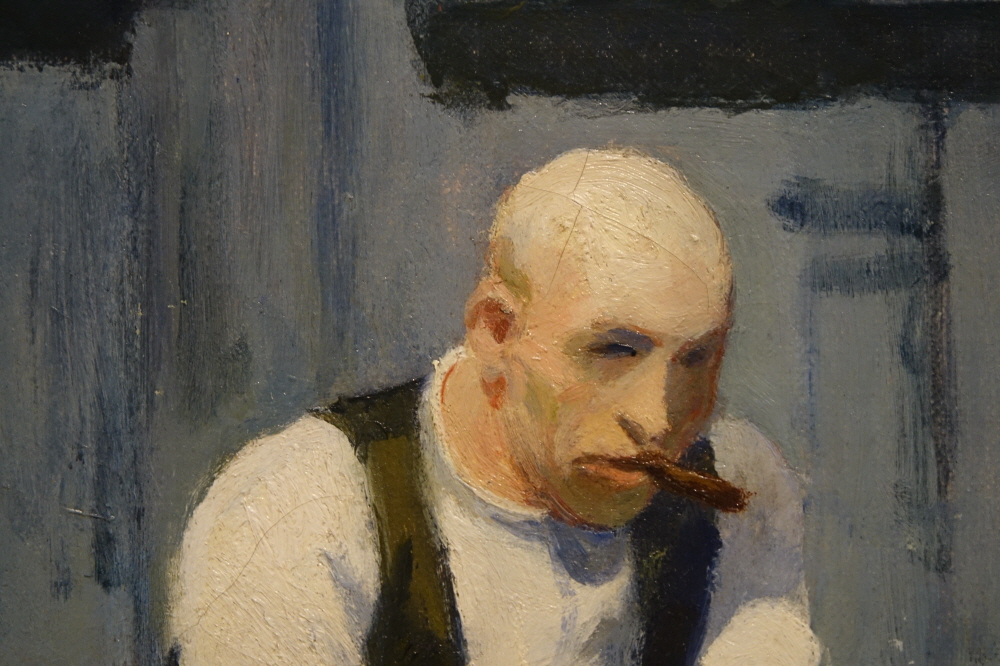 이제 나는 이 남자를 ‘제이슨’이라고 부를 참이다. 이 이름을 선택한 특별한 이유는 없다. 그저 제이슨처럼 생겼기 때문이다. 아무리 다시 봐도 이를 능가할만한 다른 이름은 떠오르지 않는다. 제이슨은 지금 상점가 보도에 앉아 있다. 여기 보이는 호보컨(Hoboken)의 어느 길바닥 한 모퉁이는 그 흔한 난간 하나, 소화전 하나, 심지어 굴러다니는 쓰레기 하나도 없는 비현실적 풍경으로 우리를 마주한다. 이 풍경이 자아내는 공허함이 몇 년 후에 찾아올 대공황의 전조라고 한다면 물론 지나친 비약일 것이다. 그럼에도 이곳은 실제로 사람이 먹고 마시며 살아가는 마을이라기보다는 완공을 눈앞에 둔 영화 세트장 같다. 이 영화 세트장에서 단역으로 기용될 기회조차 거부된 것 같은 사내는 그야말로 우울하고, 지치고, 외로워 보인다. 상품은커녕 흔한 간판이나 광고문구 하나도 보이지 않는 상점의 전면부와 다소 과장된 크기의 건물은 소외된 인격체의 무기력함과 대조를 이루고 있다. 비현실적 풍경 속에서 툭 튀어 나온 제이슨은 금방이라도 배경과 쉽게 분리될 듯 위태롭게 앉아 있다.