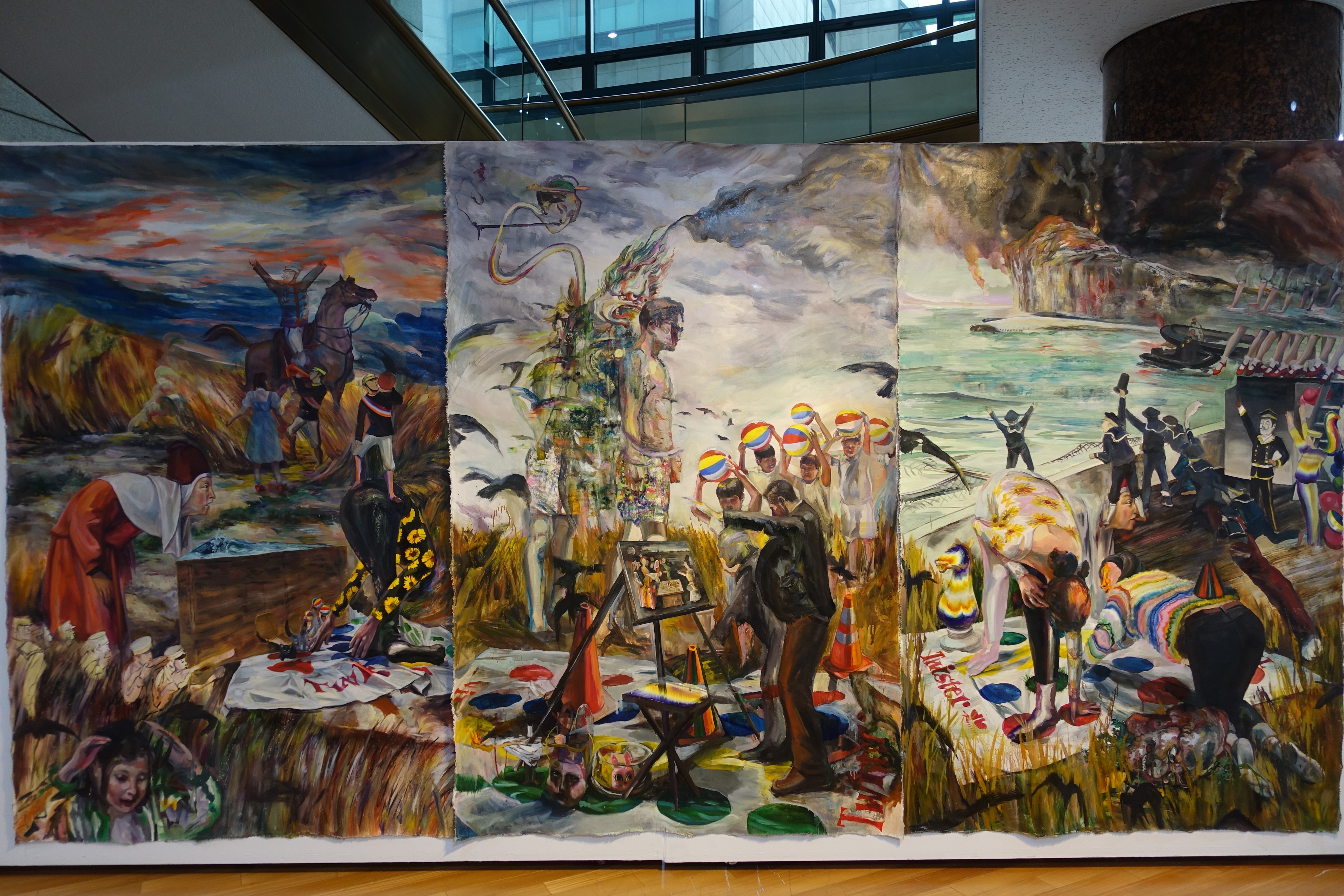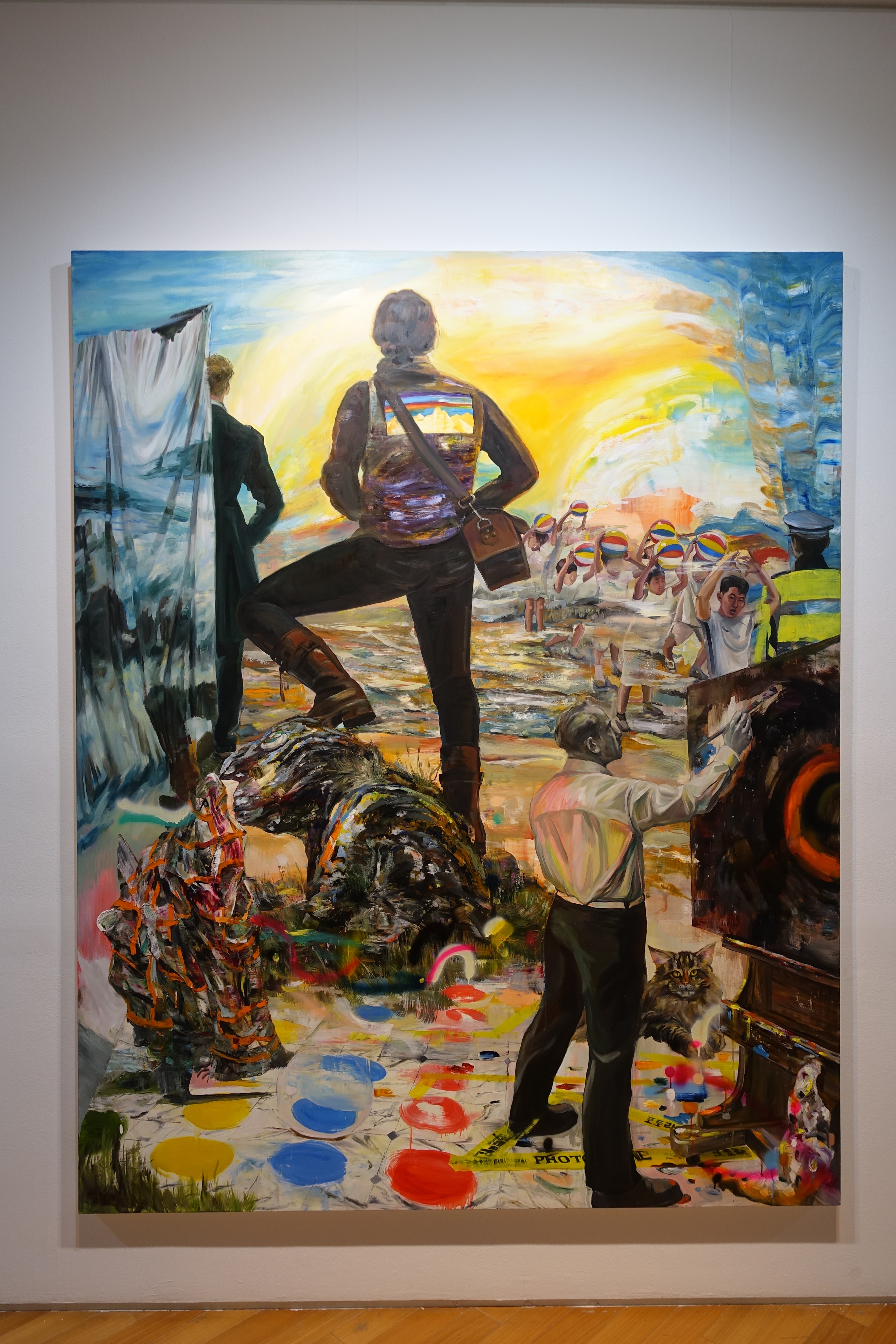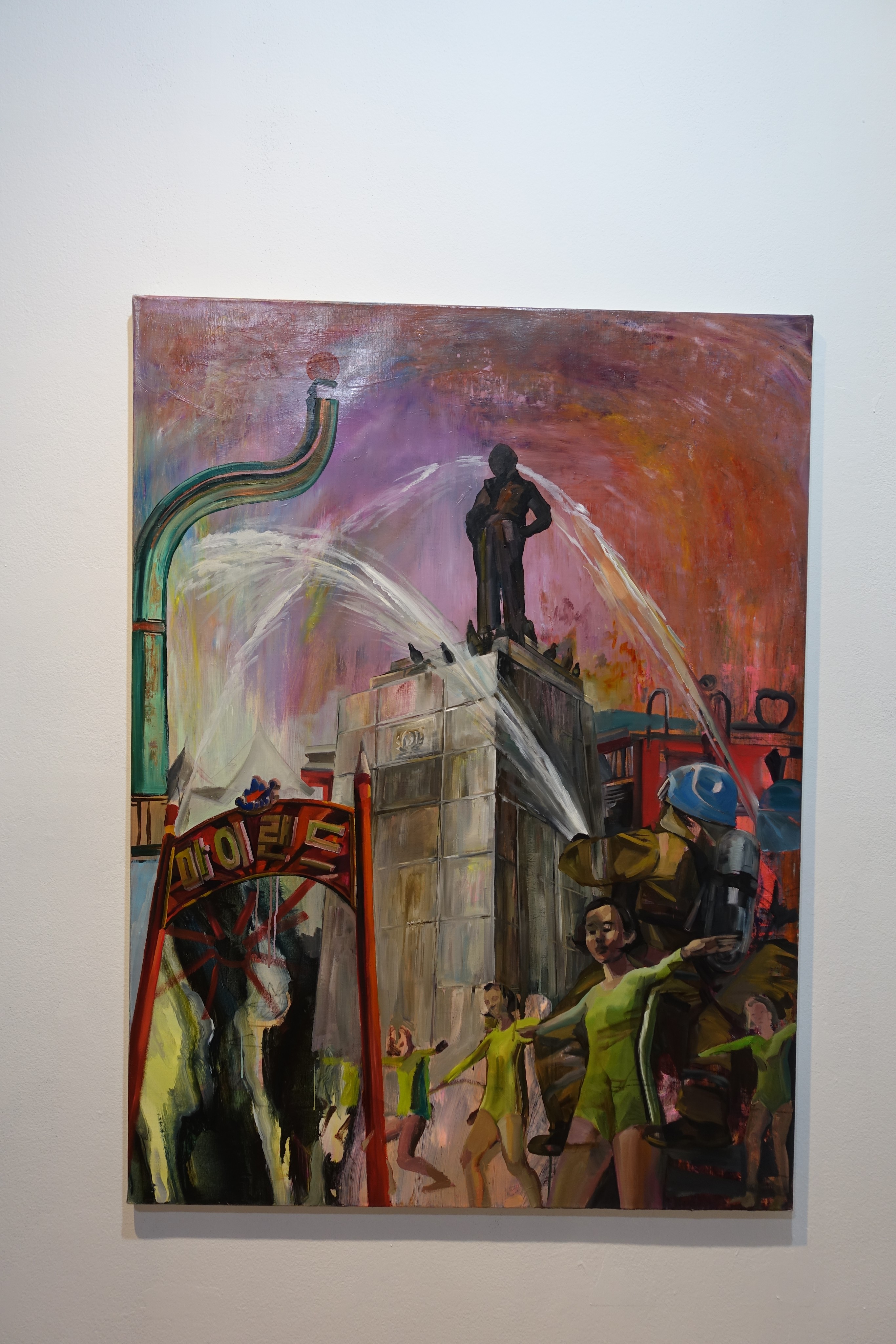 돌림판을 돌려서 지정된 색을 사지로 짚어내는 트위스터 게임, 고등학생들의 합창, 버려진 구도심과 역사적 기념비의 대치, 화염에 휩싸인 순교자, 키치로 가득한 유원지 등은 작가가 애착을 보이는 소재이다. 이 소재들은 공통적으로 잊혀진 것들에 대한 가치를 복기하고, 잠재된 목소리를 수면위로 증폭하는데 관심을 기울이고 있다. 평온한 풍경에 내재된 공포를 상기시키면서 역사의 흐름 속에 정당화된 자연스러움을 재검토하는 것이 대의명분이라면, 작가가 선택한 소재들은 그 핵심을 돌파하기 보다는 에둘러 빗겨가고 포위하는 전략적 도구들이다. 여기서 은유를 달성하기 위하여 전유하고 있는 인물상들이 사회주의적 사실주의 화폭에서 튀어나온 것처럼 보인다는 점은 확실히 아이러니한 유희이다. 굳이 설명하자면 직설적 화법의 은유다. 작가는 관객과 의미의 줄다리기를 제안했고, 도상들의 정치적 의도는 철저히 숨겨놓았다. 다만 어딘가 정치적일지 모른다는 심증만이 전시장을 감도는데, 그 정치학 교재의 세부 챕터가 구체적으로 어떠한 내용일지는 각자의 불만과 이상이 교차하는 지점에서 결정될 것이다.
