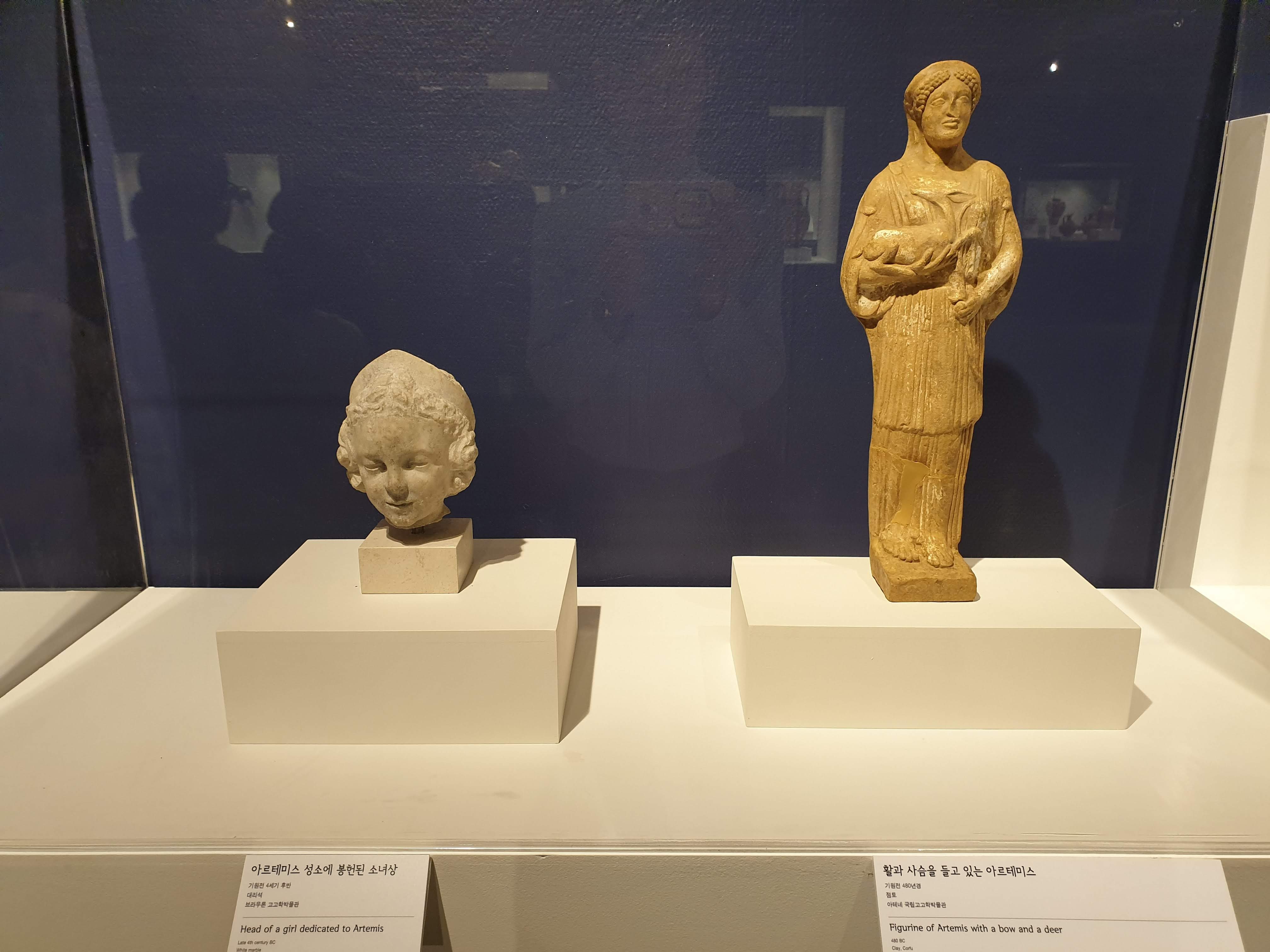 사실주의가 단순하게 선형적으로 발전한 것이 아니라는 사실은 아르테미스 여신과 관련한 두 조각상에서도 엿볼 수 있다. 비슷한 시기에 만들어진 두 조각상은 상이한 제작 목적을 따라 전혀 다른 미감을 보여준다. 좌측의 소녀상은 2000년 후인 르네상스 시대에 만들어졌다고 해도 믿을 정도로 사실적인 묘사를 보여준다. 이 조각은 분명 제작자 주변에서 발견한 특정한 소녀를 모델로 만들어졌다. 반면, 그 옆에 있는 아르테미스 조각상은 코레를 연상케 하는 이상화된 형태의 이콘이다. 도식화된 얼굴과 질서를 내포한 옷주름은 이 인물의 신성성과 영속성을 상징한다. 또한 사슴을 들고 있는 아르테미스는 어린 양을 안고 있는 예수의 도상과 겹쳐지며 서양미술사에서 종교적 이미지가 끊임없이 전용되었던 사례를 예증한다. 비슷한 시기에 만들어진 이 두 조각은 사실주의의 승리와 쇠락이 단순히 시간에만 얽매인 문제가 아니었음을 보여준다. 사실주의는 현세적인 것과 영속적인 것의 대립 속에서 당대의 가치평가가 어떠했는가를 암시하는 하나의 예시가 될 수 있다. 즉, 비슷한 시기에 충돌하는 두 양식은 제작자가 관심을 가졌던 대상이 이 땅에 속했던 것인지, 혹은 신들의 세상에 속했던 것인지를 암시하는 힌트가 된다.