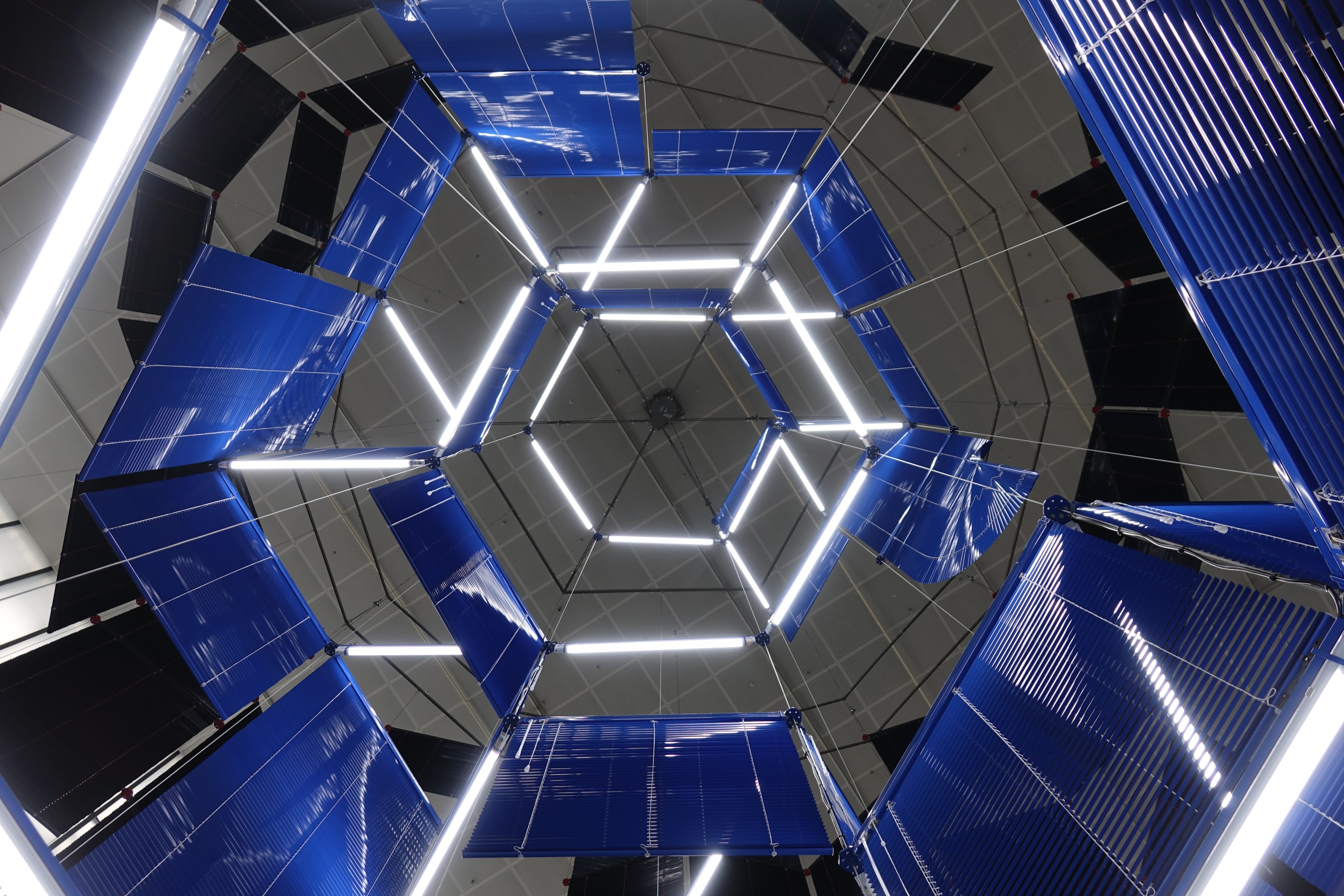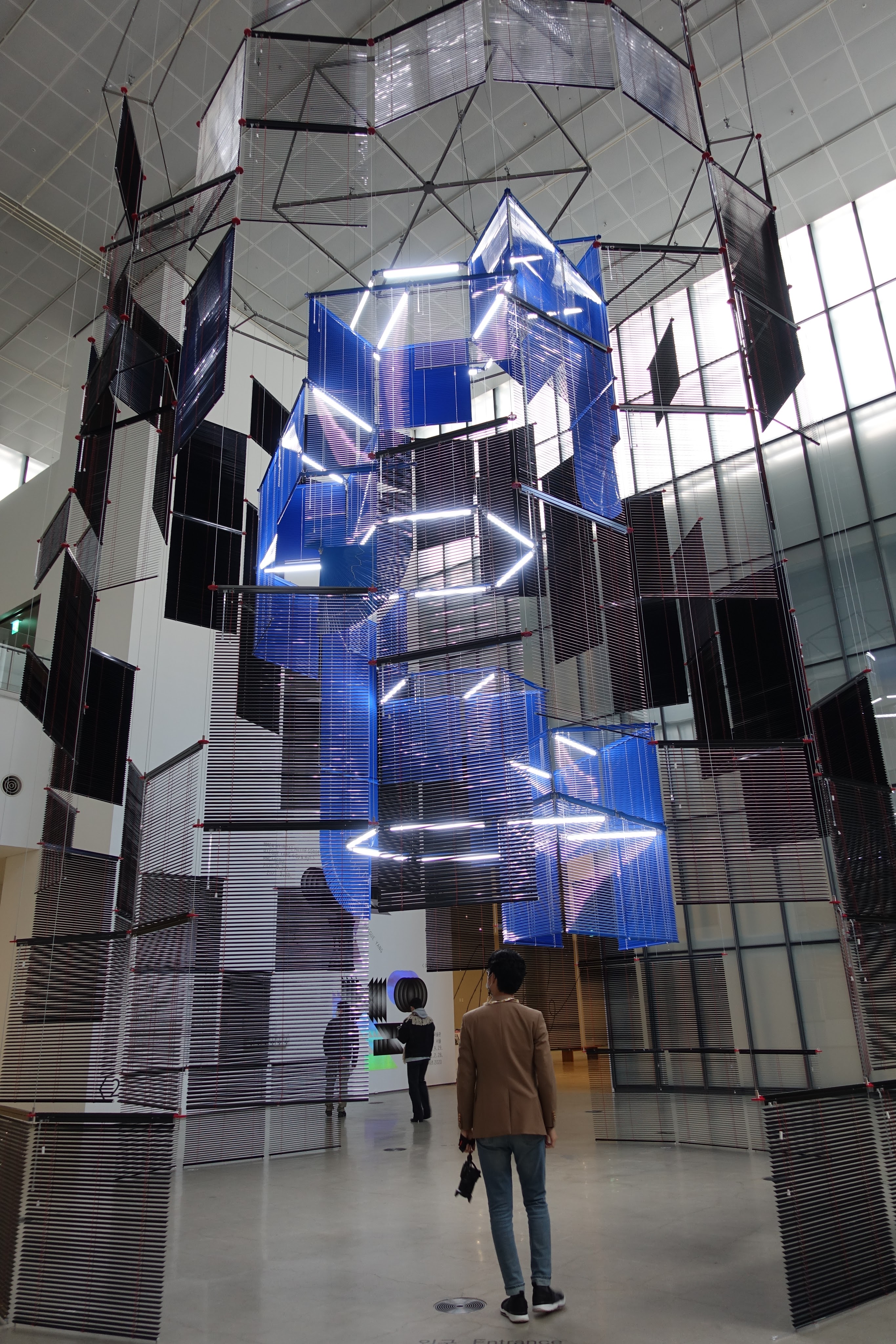 양혜규는 이항대립적 경로의존성에 매몰된 우리에게 재고의 장을 마련하였다. 그가 선택한 오브제는 이승과 저승, 안과 밖, 일상과 예술 등 대립하는 관념들을 상기시킨다. 전시장 초입에서 맞닥뜨리는 <침묵의 저장고-클릭된 속심(2017)>은 블라인드 154개를 엮어 만든 거대한 모빌이다. 이 작품의 주재료가 무엇인지에 대한 사전지식이 없다면, 코앞까지 다가가야 비로소 블라인드임을 알아챌 수 있다. 익숙한 물질이 그만큼 낯설게 쓰였다. 흔해 빠진 한갓 사물의 세심한 조합과 재구조화는 그만큼 전혀 새로운 시각성을 창출한다. 블라인드 낱장이 서로 느슨하게 엮여 나풀거리고 천천히 돌아간다. 그 아래 서서 중심을 바라보면 4차원의 세계로 빨려드는 것 같다. 블라인드는 속성상 안과 밖을 나누는 경계가 되면서 아주 간단한 조작만으로도 그 경계를 허물 수 있다. 닫힘과 열림이 교차하는 막이다.