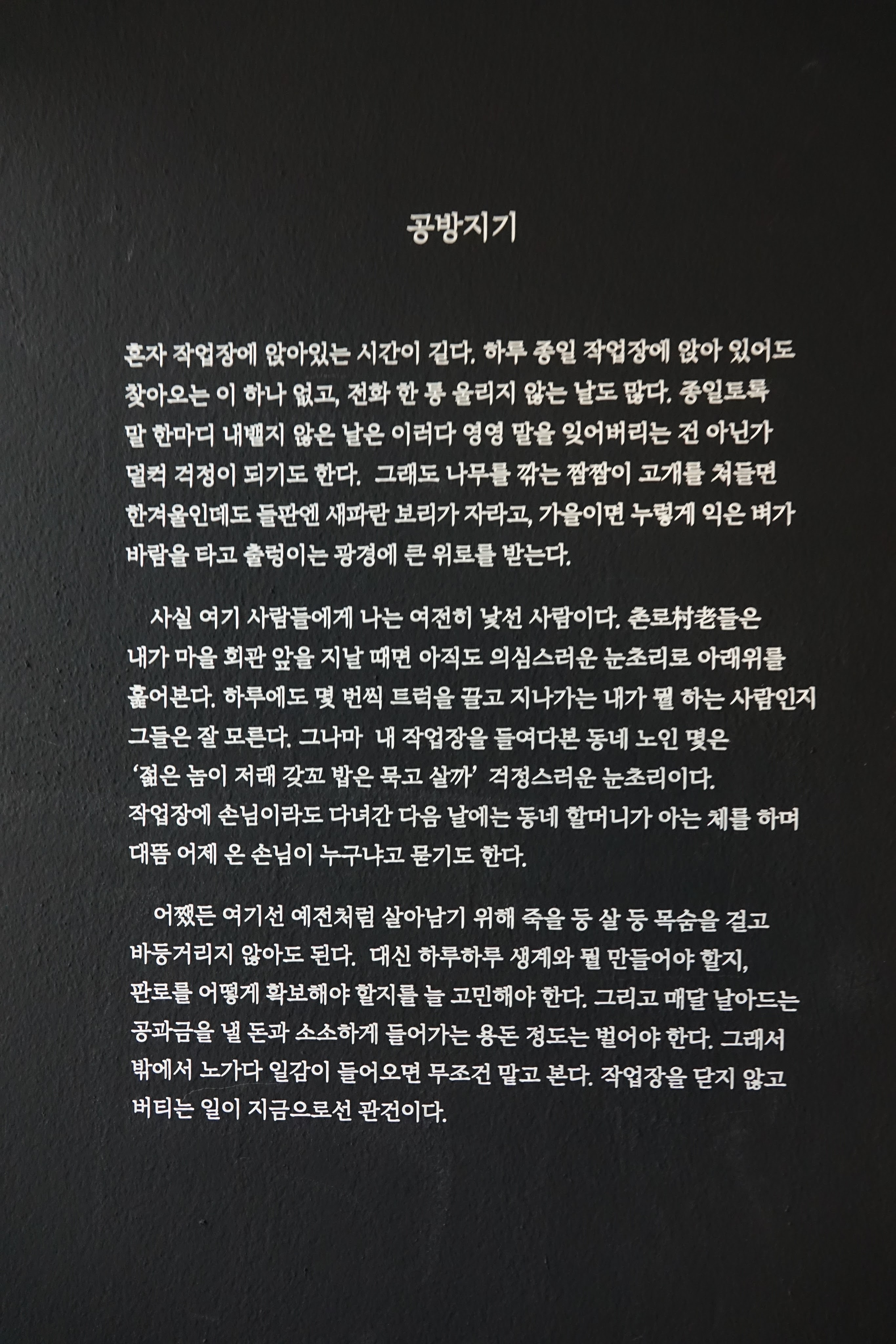 <목우공방─108 나무 숟가락> 展은 작가의 지인인 김우희 목수가 만든 각양각색의 숟가락과 직접 쓴 짧은 에세이들로 구성되었다. 전시장 자체가 화이트 큐브 속 블랙 큐브로 조성되어 진시 속 전시라는 것을 한눈에 알 수 있다.