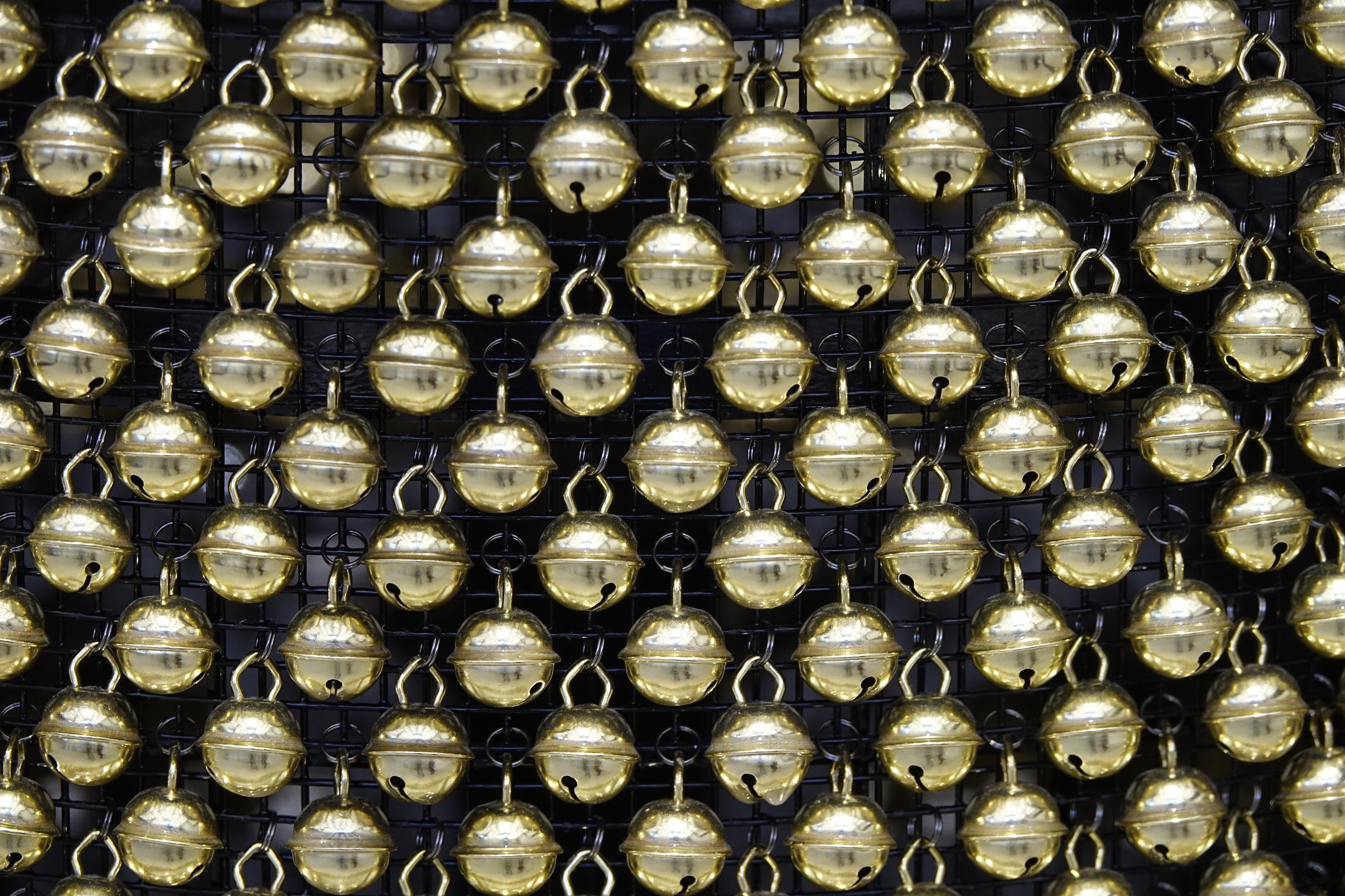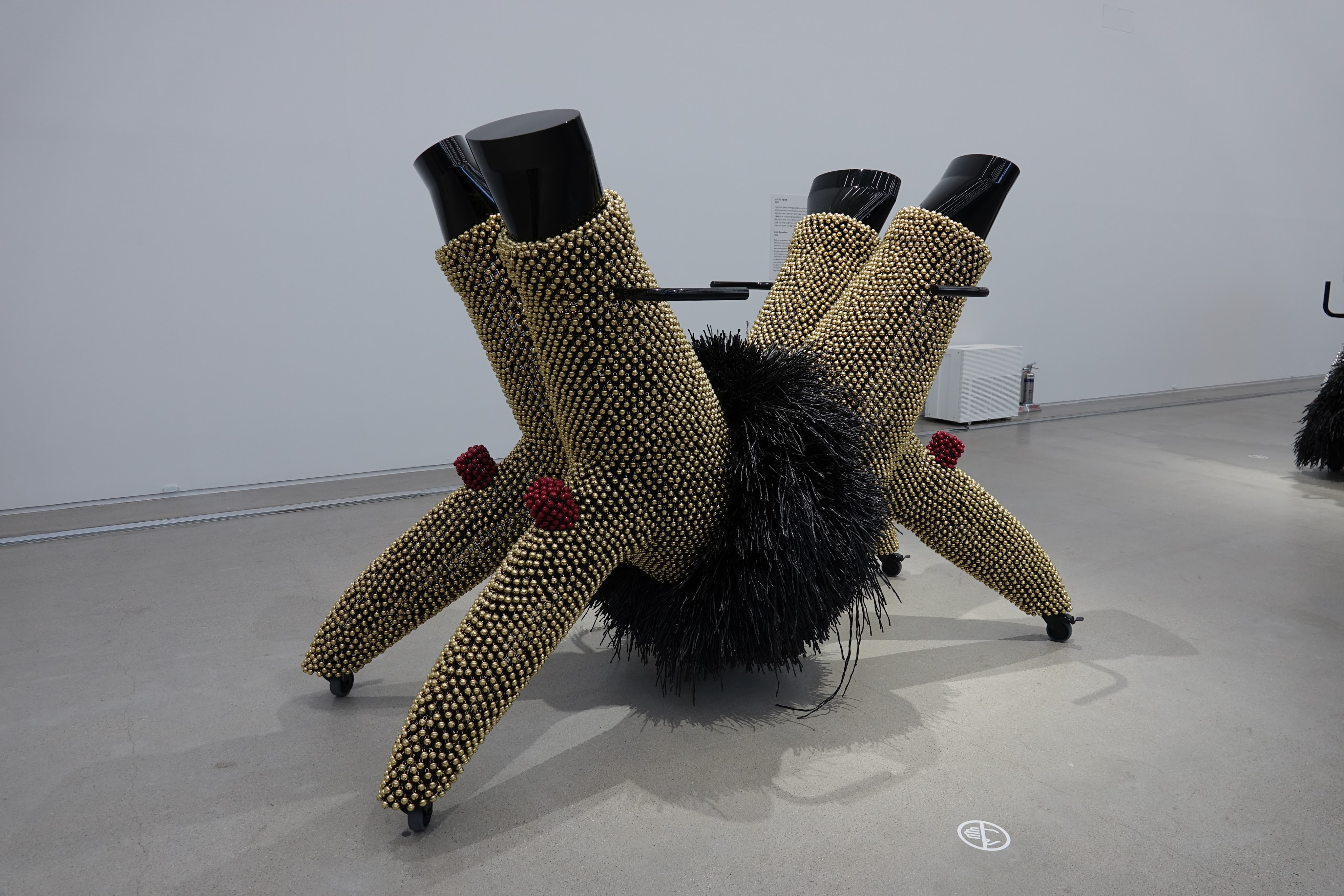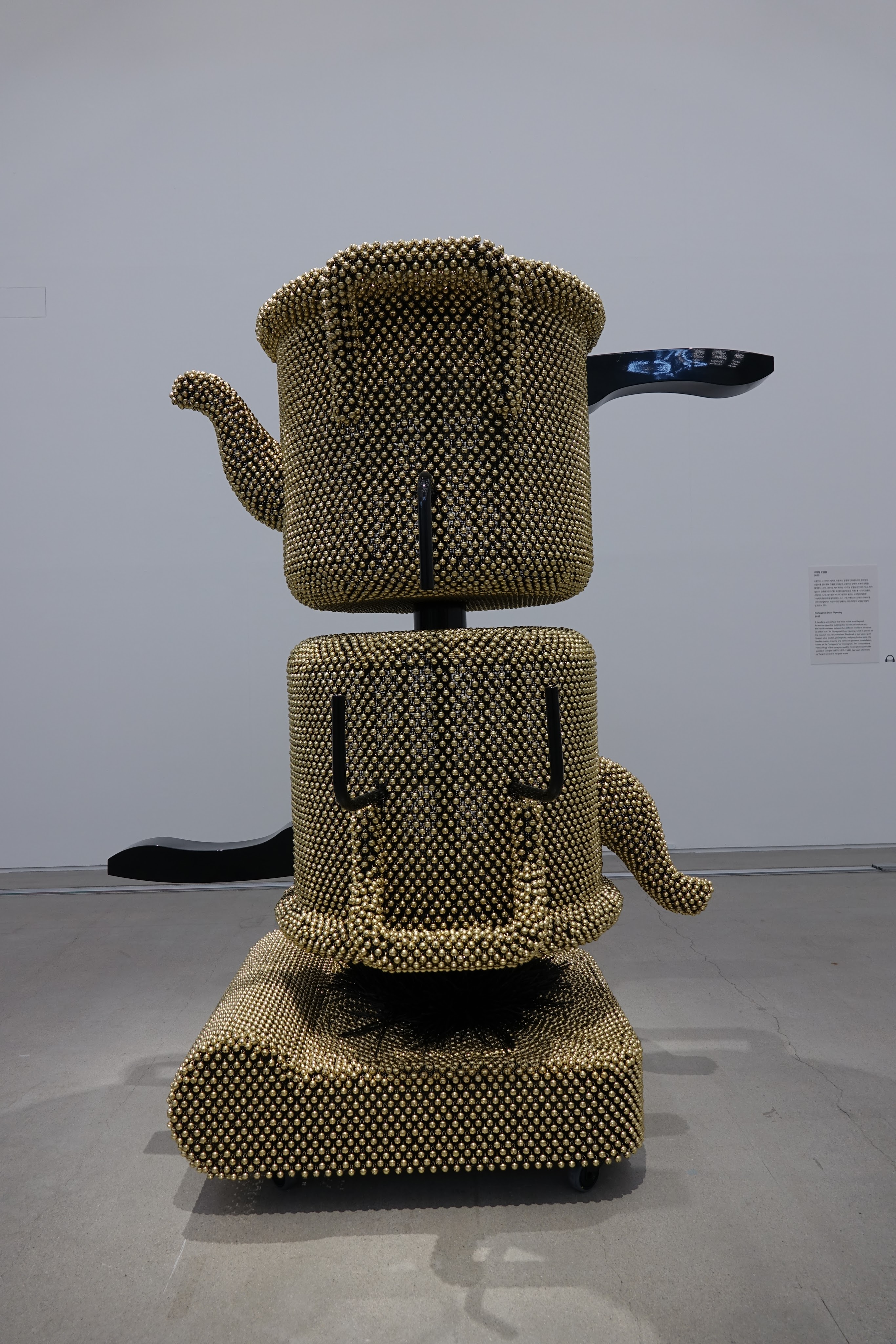 <소리 나는 가물> 연작에서 인터페이스는 금속 방울이다. 무당이 굿할 때 쥐고 흔드는 장면이 대표적인 용례다. 무당은 제의를 통해 신계와 현상계를 연결한다. 방울의 반복적 움직임과 청각적 효과는 접신의 무아지경을 한 단계 더 깊이 끌어 올린다. 지난 세기말에 나이트클럽을 주름잡았던 테크노 음악이 추구했던 전략과 유사하다. 우리는 용도가 폐기된 물체의 표면을 뒤덮은 방울을 보고, 그 짤랑거리는 소리를 이내 유추한다. 하지만 슬프게도 그 소리를 현실에서 재생할 수는 없다. 미술관에 놓인 이 “소리 나는” 물질은 ‘한국이 낳은 세계적인 작가’의 작품이라는 아우라를 덧입고 절대 손대선 안 되는 존재가 되어 좌대 위에 놓여 있다. 철옹성 같은 감시자와 함께. 손쉽게 여기저기 옮길 수 있도록 바퀴를 달아놓은 작가의 배려심은 덧없는 약 올림이 되었다. 흔들 수 없는 방울은 기호일 뿐이다.