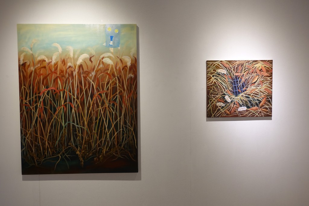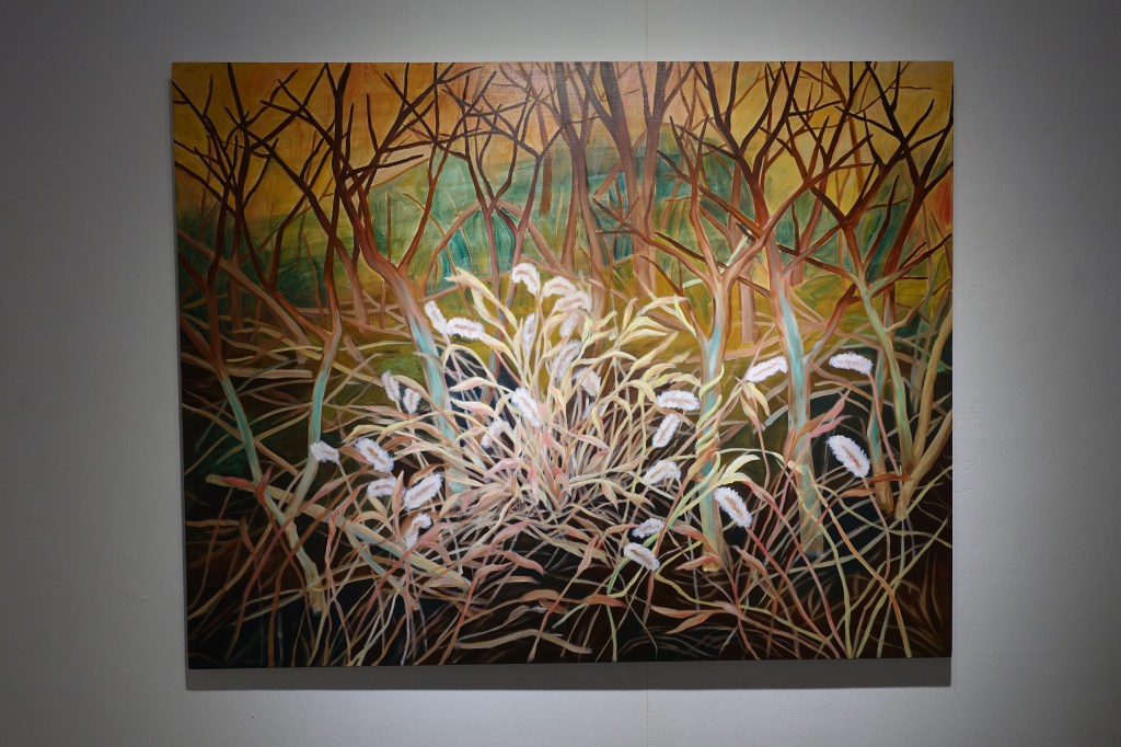 아트로직스페이스는 조그만 갤러리가 밀집한 건물의 1층에 있다. 사이아트스페이스, 사이아트도큐먼트, 사이아트큐브 등 “사이아트”라는 브랜드가 대다수 공간을 차지하고 있는 건물인데, 아트로직스페이스는 1층 전면부 유리를 보도와 인접한 외부 갤러리로 쓸 수 있다는 점에서 특권을 누리고 있다. 고즈넉한 윤보선길을 오가는 행인은 미술에 관심이 있든 없든 대체로 여기에 눈길을 한 번쯤 주게 되어 있다. 작가는 여기에 <여기 말고 어디든 다른 데로 1(2020)>를 걸었다. 이번 전시 브로셔의 메인 소개 작품이기도 하다. 작가가 정착한 충북혁신도시의 공터에서 영감을 받은 작품으로, 제멋대로 쓰러진 고목과 갈대가 마구 뒤엉킨 화면이다. 제목에서 알 수 있듯, <여기 말고 어디든 다른 데로 2(2020)>도 소개되었으며, 마지막 작품으로 내걸려 수미상관을 이루고 있다.