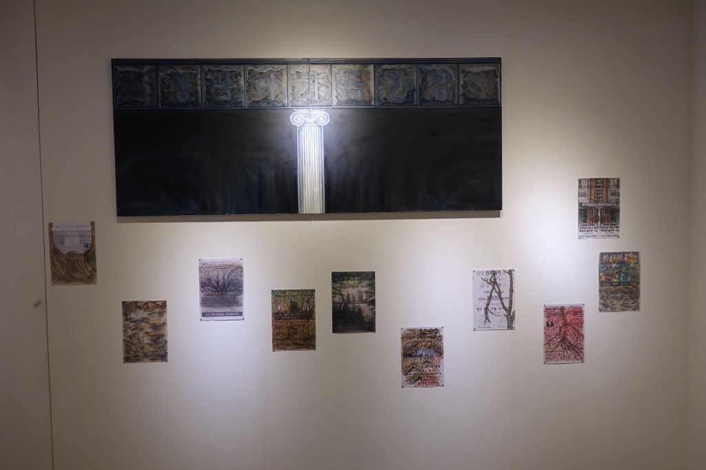 오늘날 대한민국은 부동산 광풍이 모든 이슈를 잡아 삼키는 형국이다. 5.972×10^24kg에 달하는 지구에서 한 점 표면을 차지하겠다고 난리를 치는 모양새가 퍽 가관이다. 역세권 신축 아파트를 가지면 정말 행복할까? (사실은 나도 그렇지 않다는 대답은 차마 못 한다) 욕망은 거기서 끝날까? (이건 그렇지 않다고 확실하게 말할 수 있다) 이오니아식 주두를 받치고 우뚝 선 <행복이가득한집(2020)>의 현판은 물리적 공간으로서 집이 진정한 행복의 조건이 될 수 있는지 묻고 있다. 이러한 의문은 행복을 전면에 내건 무언가가 오히려 행복과 거리가 있다는 합리적 의심에서 기인한다. ‘해피콜’이라는 용어를 가만히 생각해보면 무슨 뜻인지 알 수 있을 텐데, 전화를 거는 사람이나 받는 사람이나 전혀 행복하지 않은 상황에 놓이는 것이 바로 해피콜이다.