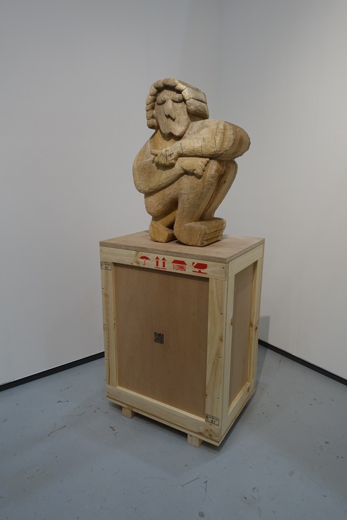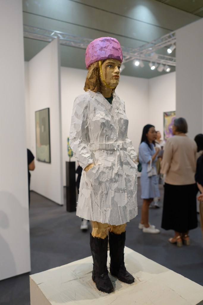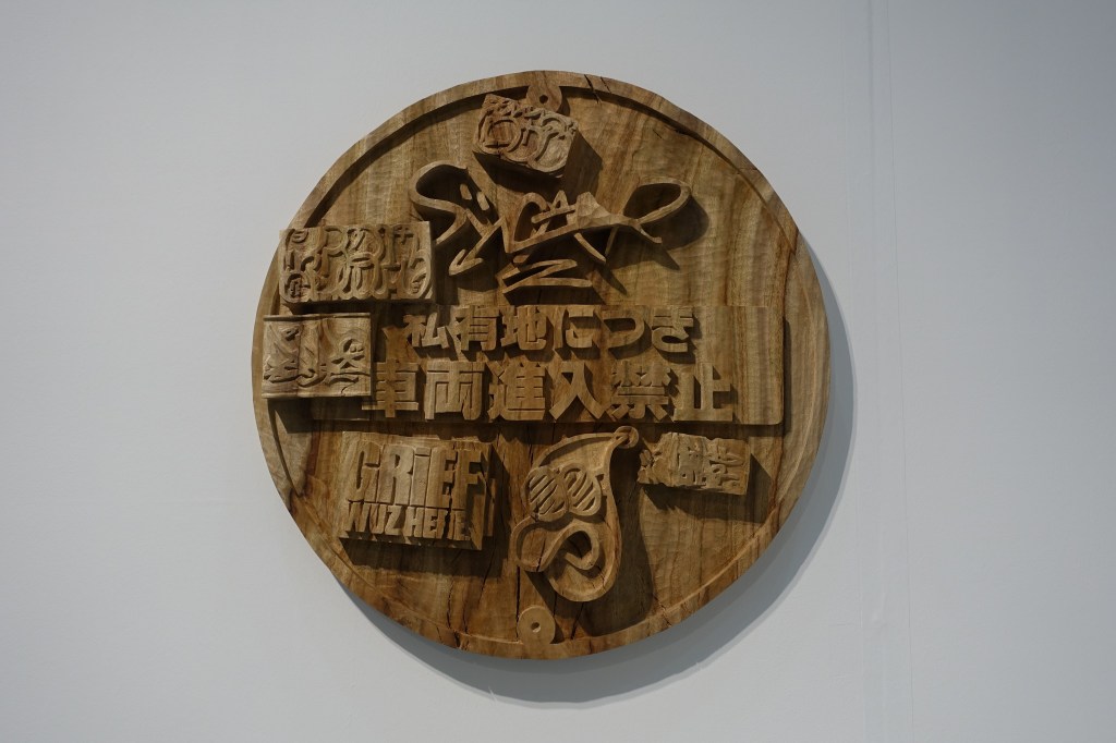 나는 오사카의 마르코(Marco) 갤러리가 소개한 요시무라 타이치(Taichi Yoshimura, 葭村太一)의 작품을 유심히 봤다. 부스 전체가 요시무라의 작품으로 채워졌는데, 그 근처만 가도 짙은 나무 향이 느껴졌다. 마감을 덜 해 정과 끌 자국이 투박하게 남은 조각인데, B급 만화 캐릭터 또는 일본 특유의 요괴 같은 형상이 나타나기도 하고, 국적 불명의 글씨가 적혀 있기도 하다. 조형미가 있어 작품 하나에 다가가 팔짱을 끼고 지긋이 바라보노라니 친절한 부스 직원이 다가와 설명해준다. 작가는 길거리에서 흔히 볼 수 있는 그래피티, 광고판, 불법스티커 등 놓치기 쉬운 도심 속 B급 형상들을 수집해 그것을 깎아 항구화하는 형식의 작업을 진행한단다. 그러고 보니 개체의 자유분방한 윤곽은 그래피티의 언어와 똑 닮았다. 건네받은 브로셔에는 작품 이미지와 QR코드가 연계되어 있는데, 그 코드를 찍으면 구글맵과 스트리트뷰로 이동한다. 이미지의 원천이 실제 놓여 있는 특정 장소의 좌표와 사진을 보여준다. 장소의 실존적 감각과 작품의 비정형적 형태를 병치해 놓았다.