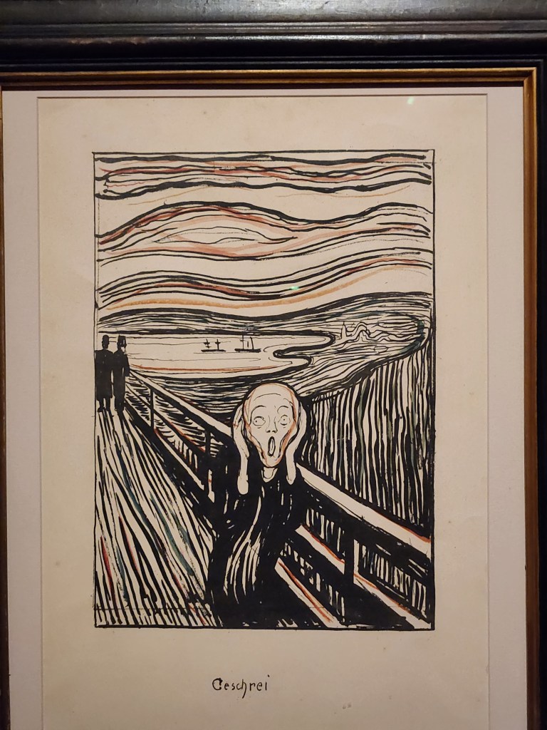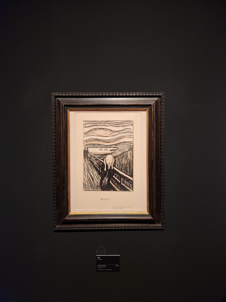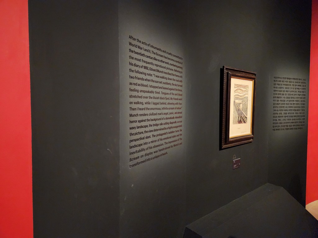 전시의 중간쯤, ‘생의 프리즈’ 연작이 배치된 방에 채색한 판화 버전의 <절규>가 출품되었다. 희노애락, 욕망과 좌절, 온갖 신경증이 교차하는 판화들이 붉고 넓은 방에 촘촘하게 내걸렸고, 그 끝에 <절규>가 있다. <절규>는 다른 판화들과 구별되는 독립된 성좌에 앉아 있다. 넓고 까만 하이라이트 벽면을 독차지한 <절규>는 좌우에 한영(韓英) 설명문을 달고 이 작품이 어딘가 특별하다는 점을 분명히 암시하고 있다. 같은 그림이 전시 브로셔의 표지로 등장하고, 전시장 입구의 포토존에서도 등장하면서 <절규>를 향한 삼위일체의 여정은 여기서 마침표를 찍는다. ‘비욘드’가 성립되려면 그 외 작품들이 최소한 <절규>의 대관식만큼, 혹은 그보다 더 풍성한 의미를 주어야 하는데, 그랬는지가 의문이다.