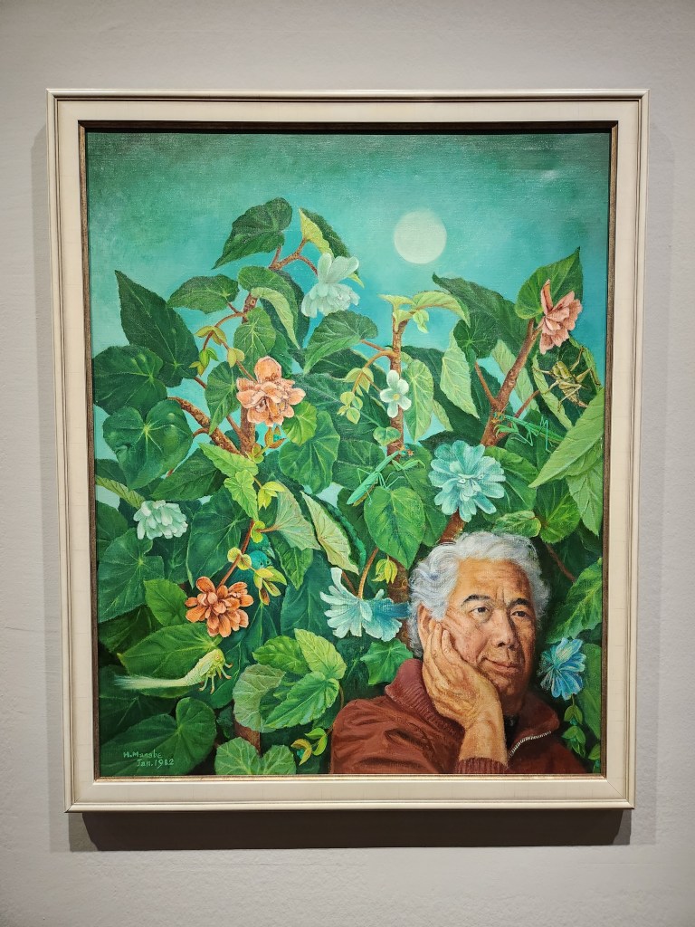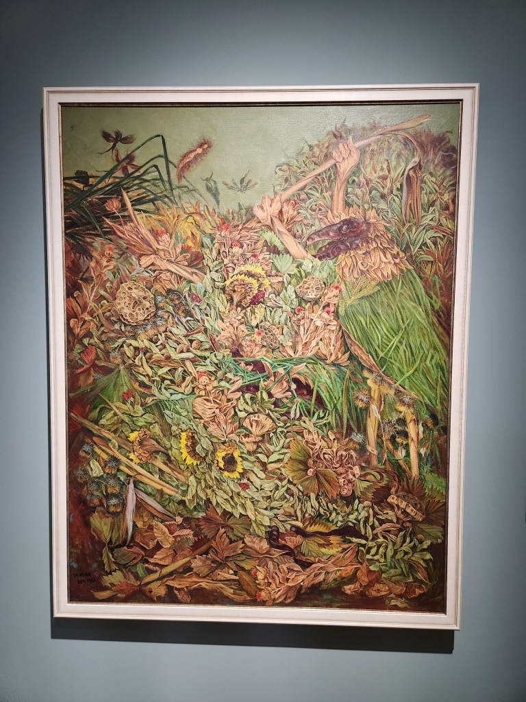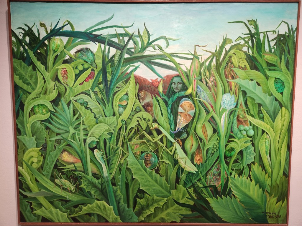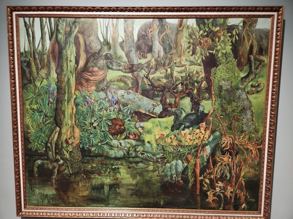 이어서 여섯 예술가가 작은 회고전을 꾸렸다. 김종남(마나베 히데오), 김욱규, 김종하, 박광호, 김영환, 신영헌 순이었다. 김종남의 작품이 가장 인상적이었다. 언뜻 보면 정교하게 묘사한 자연 풍경 같지만 계속 보다 보면 어딘지 모르게 비현실적인 구석을 발견하게 된다. 공존할 수 없는 개체들이 한자리에 모여 있다. 풀 무더기 속에 불온한 눈빛이 서성거리고 작은 동물과 곤충들이 존재감을 드러낸다. 뜬금없이 모나리자와 눈을 맞추기도 하고, 풀 무더기의 배열이 고전 성화 속 형상을 암시하기도 하는데, 주세페 아르침볼도(Giuseppe Arcimboldo)의 장난기도 연상케 한다. 보호색을 두르고 조용히 숨어들어 간 작은 생명체들은 조선인으로 태어나 평생 정체성을 숨기고 일본인으로 살아가야 했던 화가의 불안한 정체성을 암시하는 것이라고 기획자는 설명한다. 자연, 욕망, 그리고 다난했던 삶의 궤적을 표상하는 온갖 오브제들에 뒤섞인 자화상은 하나의 회화가 그 자체로 더 이상의 추가적 설명이 불필요한 자족적 전기로서도 기능할 수 있음을 예증한다.