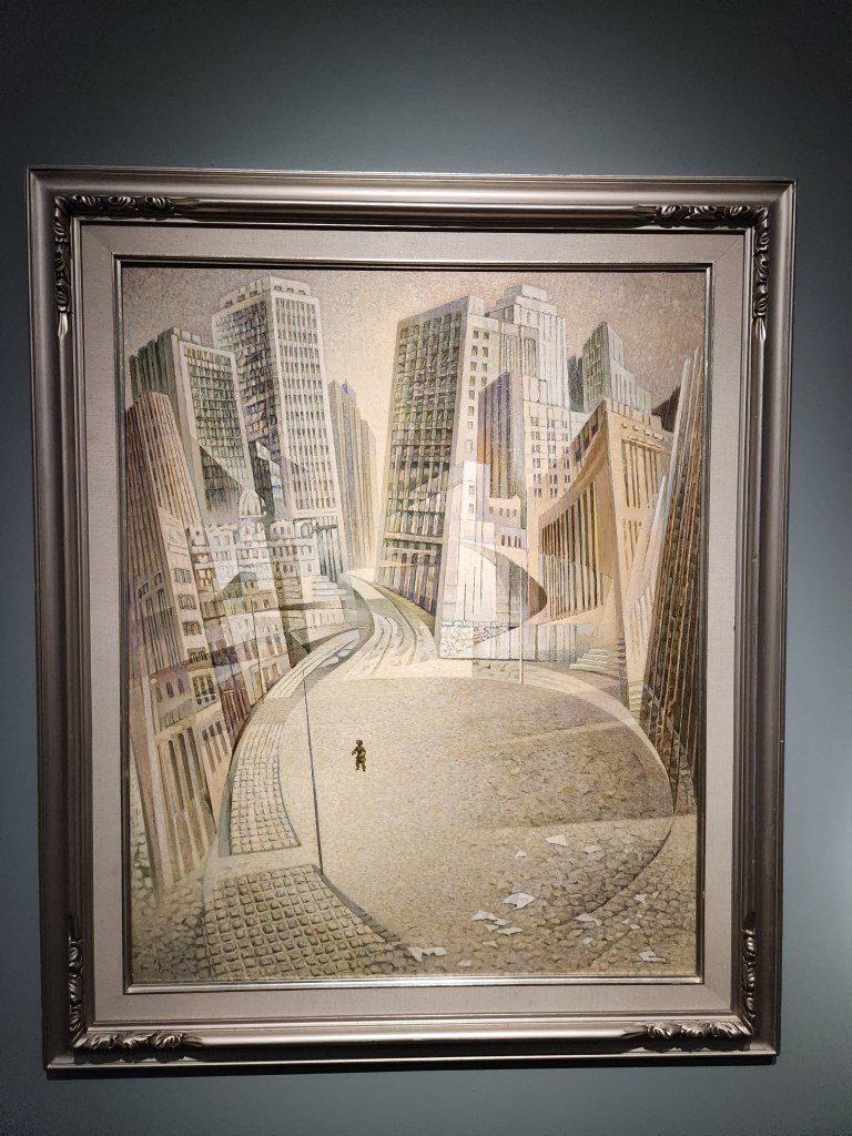 신영헌은 이쾌대의 성북회화연구소 출신이라 그런지 회갈색조의 스산한 분위기가 엿보이는 독창적 화풍을 보여주었다. 묘하게 수묵담채화가 녹아든 듯한 그의 회화에서는 생성형 AI에게 한국적 초현실주의를 그려달라고 요청하면 제시해 줄 법한 전형성이 엿보이지만, 동시에 최첨단의 게임 홍보용 일러스트를 보는 듯한 혁신적이고 담대한 구도도 돋보인다. 분절적인 형상들이 하나의 덩어리로 융합되면서 더 큰 주제의식과 결부되는 몰입도 있는 구성에서 연출가적 기질이 드러난다. 그의 이력에서 주로 종교 화가로서의 면모만이 부각되어 왔었다는 것이 사실이라면, 이번 전시에서 드러난 초현실주의적 일면은 전시기획 의도에 가장 부합하는 대목이라고도 볼 수 있다.