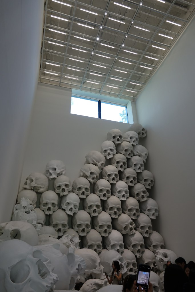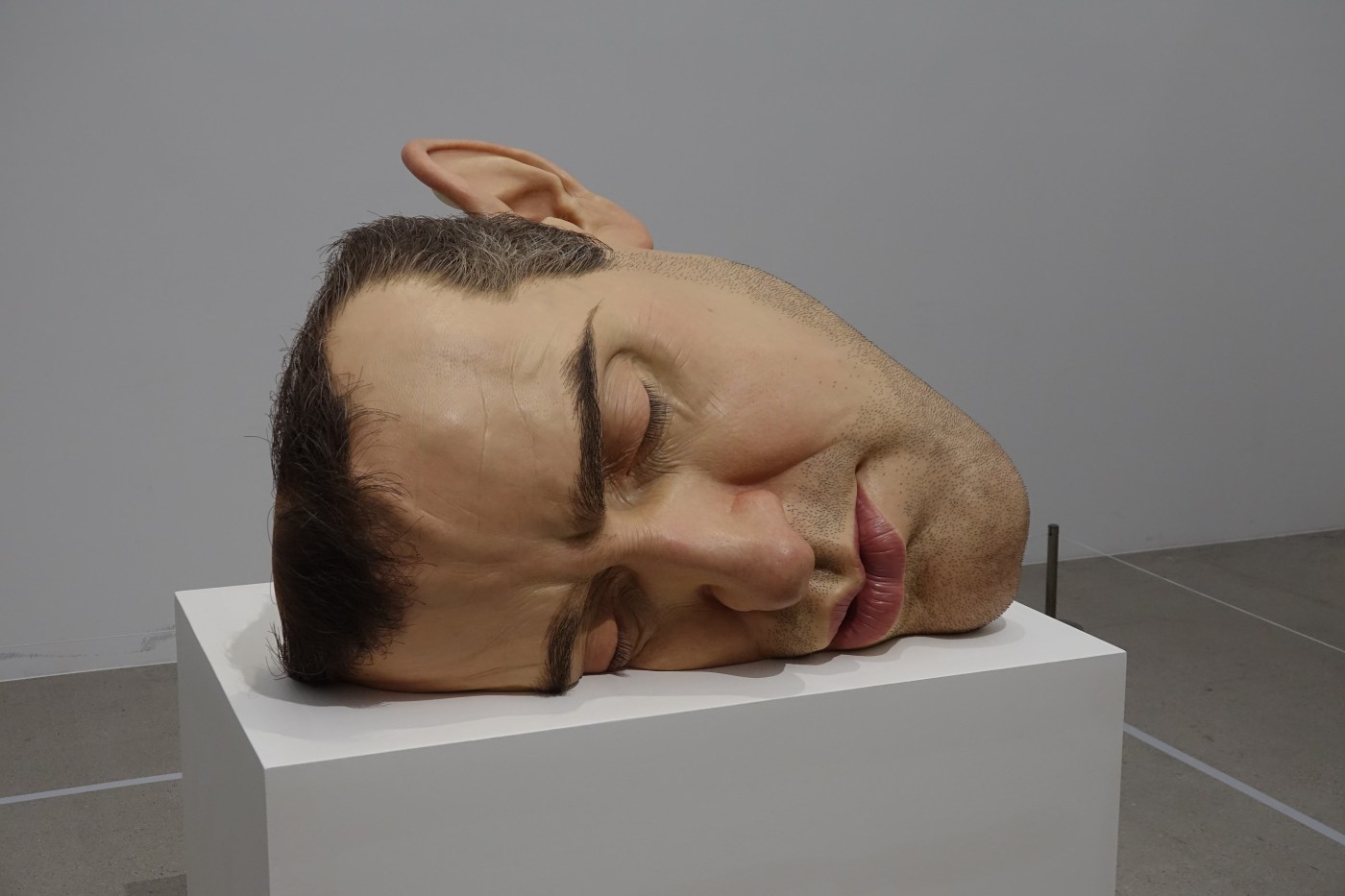 반면, 진짜 흥미로운 지점은 작가가 의도하지 않는 해석의 문이 열릴 때 비로소 발생한다. 이번 전시에서 오브제가 놓인 특별한 상황은 작가의 계산을 보기 좋게 비껴간다. 론 뮤익이 작품의 대상으로 전혀 다뤄본 적 없는 특정 인종의 관람객이 절대다수 비율로 꽉 들어찬 전시장에서, 관람객들은 무질서를 요구하는 안내 직원들의 통제를 가뿐히 무시한 채 거의 완벽에 가까운 질서를 유지하려고 안간힘을 쓰며 집단지성을 모아 암묵적 규범을 자체 생산해 낸다. 세계적 품질의 공교육 12년과 고등교육 4년+@를 준시민권 수준으로 이수한 이 동아시아 국가 관람객들은 ‘줄을 서실 필요가 없다, 작품에는 순서가 없다, 자유롭게 이동하면서 관람하셔라’라는 무질서의 규범을 좀처럼 따르지 못한다. 그들의 DNA에는 따가운 시선을 받으면 폭발하는 유전인자가 아로새겨져 있다. 줄을 서서 입장했으니, 줄을 서서 관람한다. 관람객의 행렬은 컨베이어 벨트처럼 돌아가지만, 그럼에도 인증샷은 제때 찍어야 하고, 중간중간에 나와 작품이 한 앵글에 포함된 사진도 따가운 눈총 속에 하나쯤은 남겨야 한다(좁은 통로에도 불구하고 기념비적 규모의 <매스(2016-2017)>를 배경으로 인증샷을 찍는 청춘들의 뻔뻔스러울 정도의 당당함이 어느새 마냥 부러운 그런 나이가 됐다.). 이 대목에서 작품과 나의 특별한 조우를 고대했을 관람객들이 마주하는 뜻밖의 미적 경험은 질서정연한 군중의 흐름에 포위된 작품을 바라보는 제삼자적 주체로서 느끼는 생경한 소외감이다. 작품이 나에게 건네는 말을 듣고 싶었으나, 그 말은 내 눈앞에서 어슬렁거리는 다른 관객의 단단한 뒤통수까지 뚫고 나의 신경계에 도달하지 못한다. 그 공허한 빈자리를 대신 채우려는 듯 육중한 화이트큐브에 왕왕거리는 목소리는 구경거리가 된 주체에 관한 사유다.