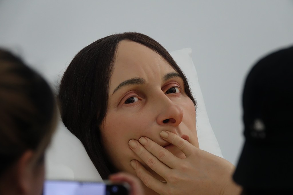인고의 시간 끝에 인파에 떠밀려 모스크, 아니 전시장에 들어서면 살결, 주름, 잔털, 뾰루지 하나하나까지 정교하게 묘사된 극사실적 인물상들을 만나게 된다. 대체로 수수께끼 같은 감정에 휩싸인 인물들이 일순간 얼어붙은 채 무방비로 시선에 노출되어 있다. 물리적 매체가 와해된 오늘날 개념주의 시대에 이처럼 사실적이고 형상적이면서 과도할 정도의 장인정신으로 똘똘 뭉친 시대착오적 작품이 왜 필요한지 생각하다 보면, 미적 경험이라는 예술의 본령 하나가 자연스레 떠오른다. 너무나 현실적인 형상들이 너무나 비현실적인 스케일로 우두커니 공간을 점유하고 있다는 것 자체가 생경한 미적 경험으로서 의미가 있음을 깨닫게 된다. 우리는 일상에서 도저히 경험할 수 없는 이 생경함을 (유튜브로 보는 대신) 물리적으로 직접 체험하려고 무지막지한 대기의 수고로움도 마다하지 않고 별도의 시간과 비용을 할애해 이 자리에 선 것이다. 대가를 치러야만 닿게 되는 사유의 지평이 있다. 수고로움이 길어 올린 각자의 기억과 해석이 작품과 융합되면서 수천수만의 사유가 생성되는 것이다. 론 뮤익의 장인정신은 정교하면서도 재기 넘치는 인물상과 실제 피가 흐르는 인물의 마주침이라는 사건을 촉발하면서 어느 정도 예측된 방향으로 그렇게 흘러간다.